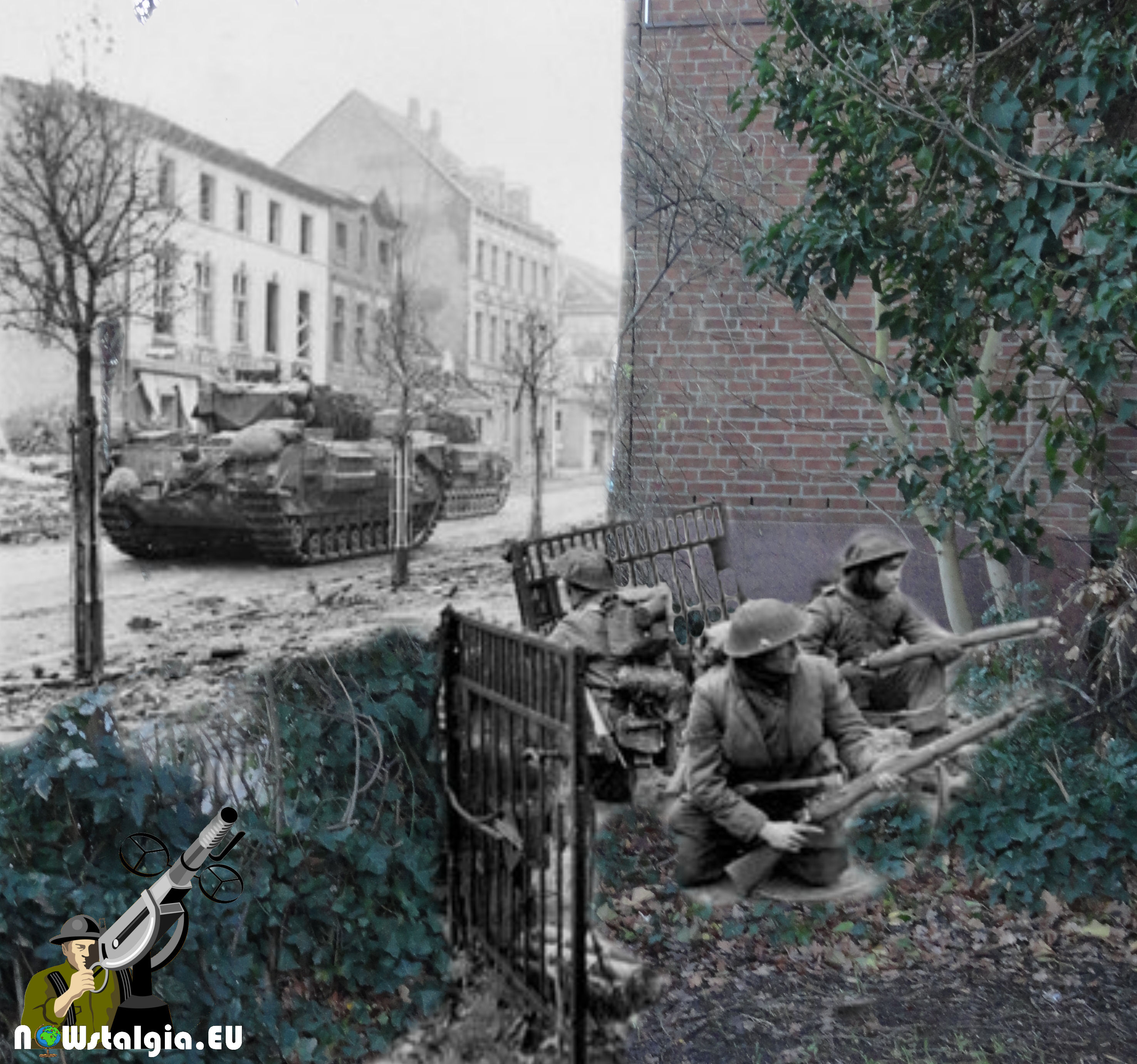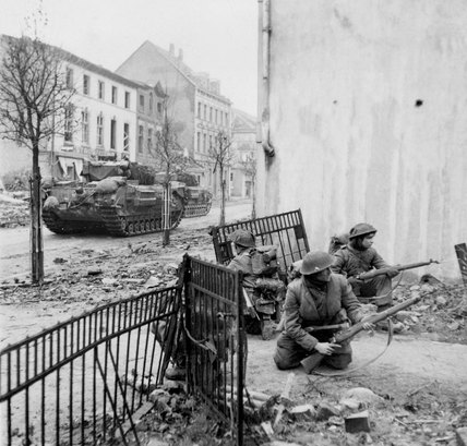 Churchill tanks of 6th Guards Tank Brigade and infantry of the 2nd Gordon Highlanders in Kleve, 11 February 1945.