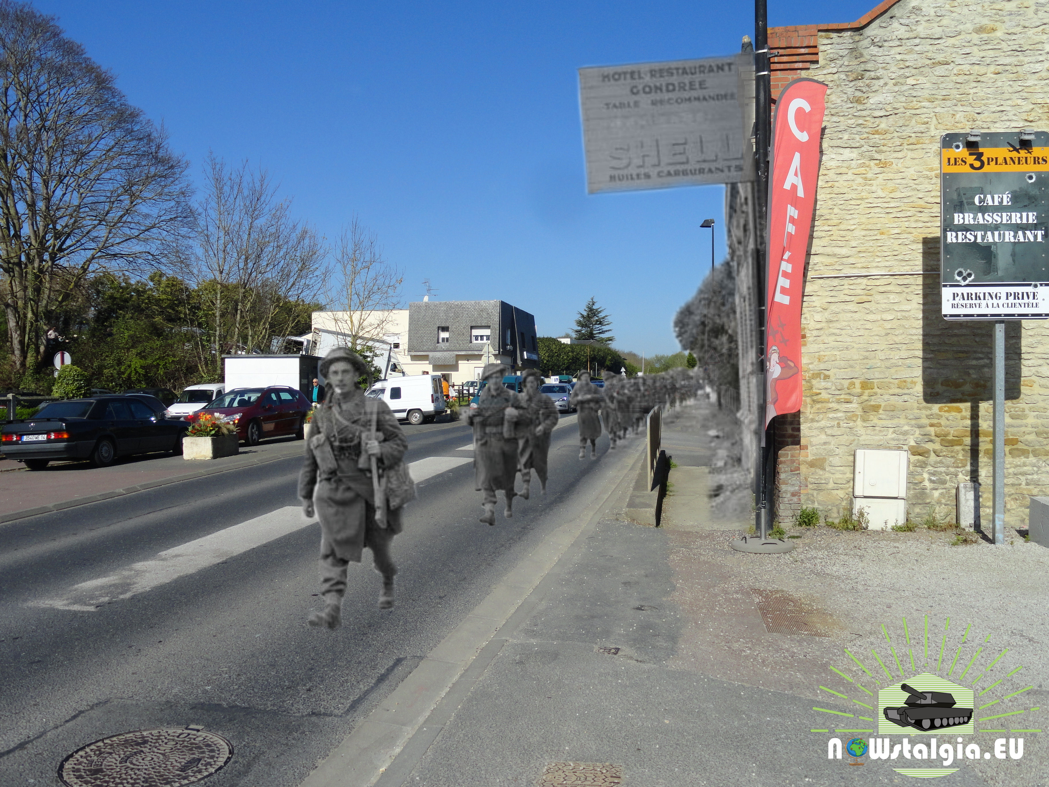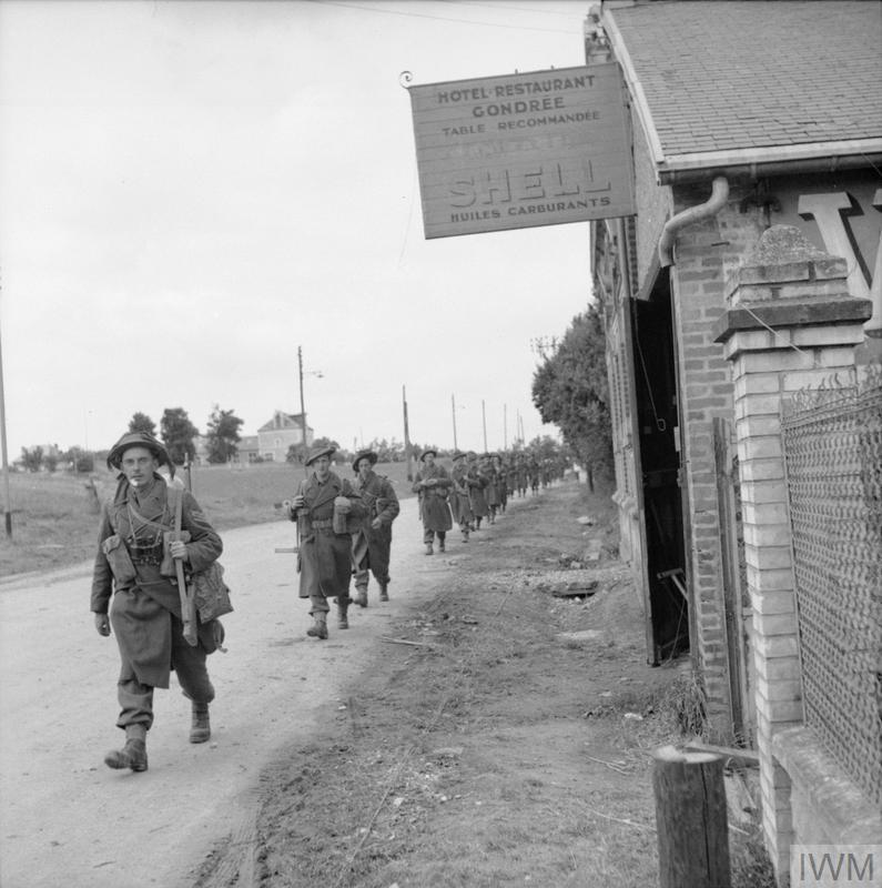 British troops pass the Hotel Restaurant Gondree at Benouville, near ‘Pegasus Bridge’ over the Caen Canal, 9 June 1944.