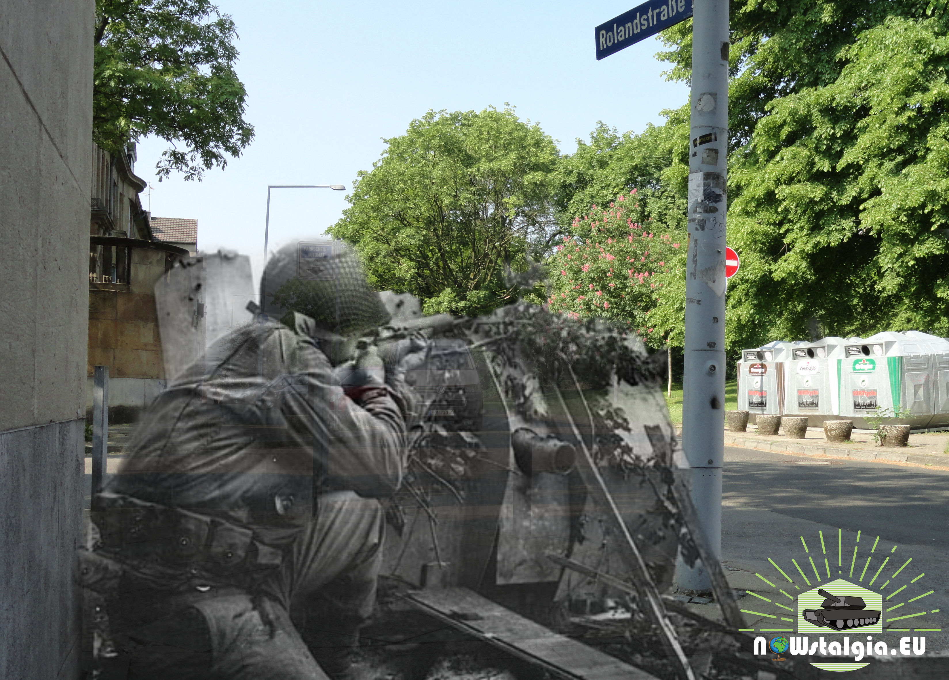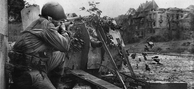 Soldier William Zukerbrow taking cover after a German 47mm anti-tankgun, 19th of October in the Rolandstraße, Aachen.