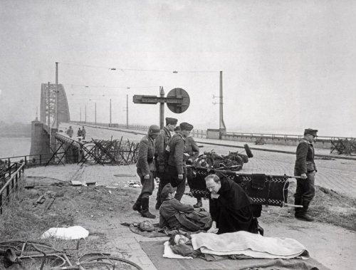 Wounded German soldiers are cared fore by a priest, Waalbridge Nijmegen 1944.
