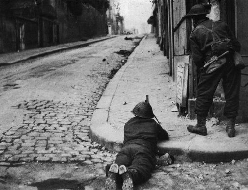 Caen, Rue des Chanoines, 1944. Two Scottish soldiers of the KOSB are watching a girl comes closer.