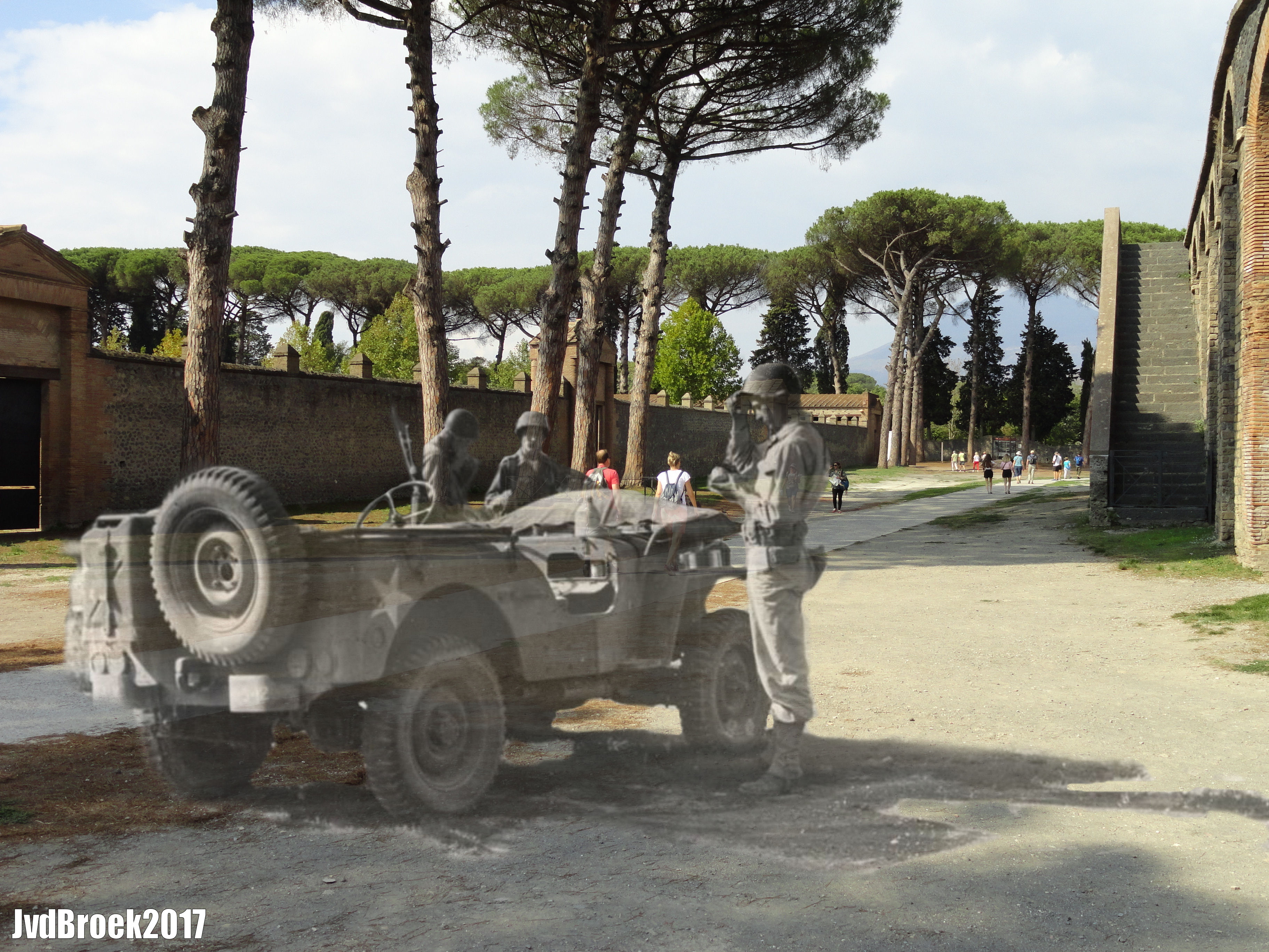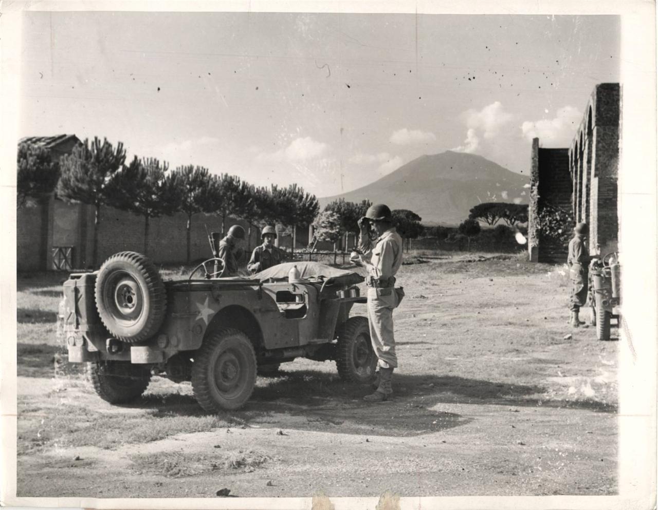 Operation Avalanche:  US troops in Pompeii in 1943 near the Amfitheater. Between the trees you can see the Vesuvius.