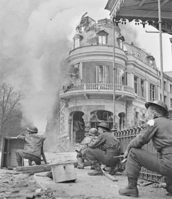 British troops at the Oude Kraan corner Bergweg in Arnhem, 12 april 1945. This location is so much changed it’s not reckognisable anymore.