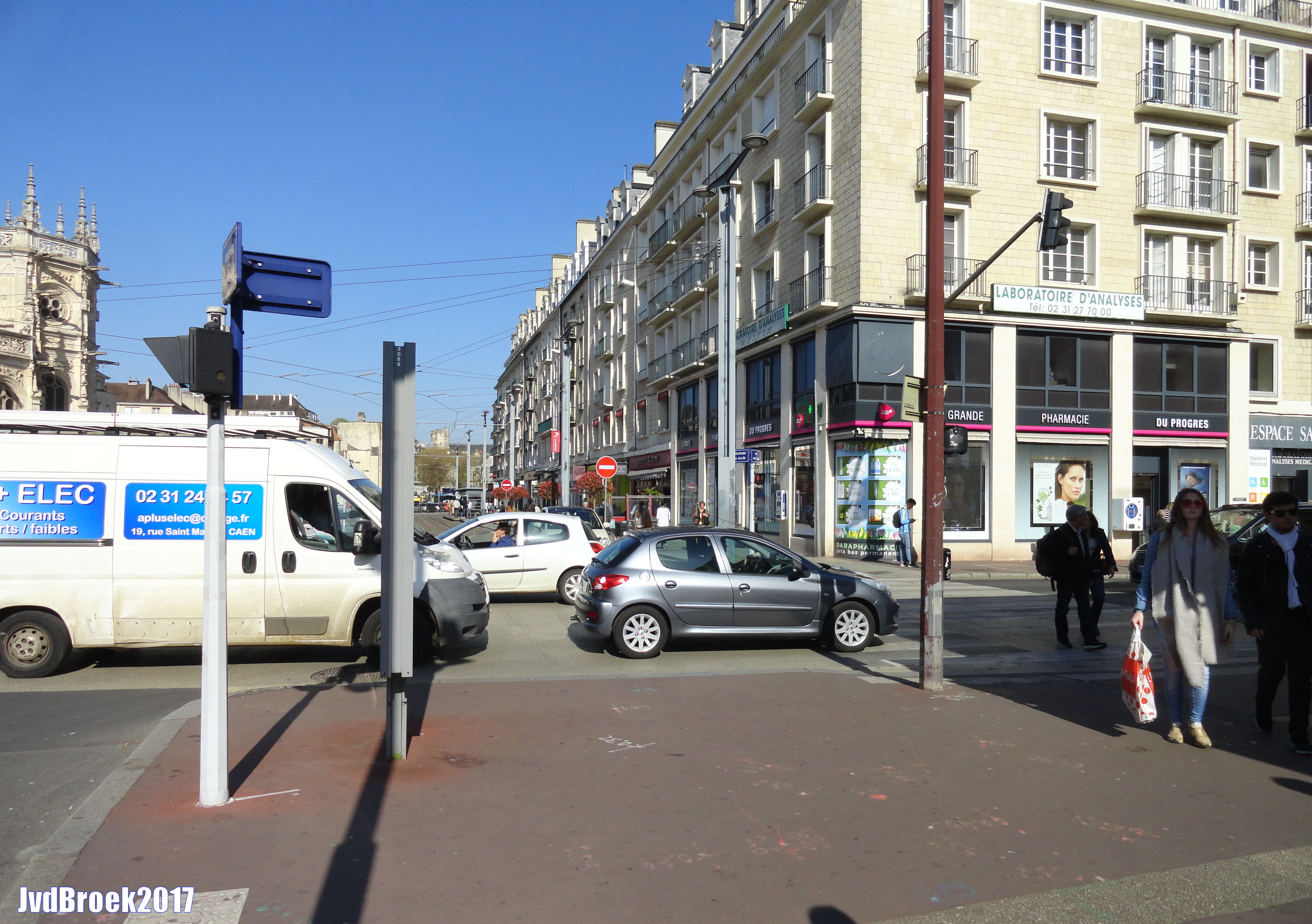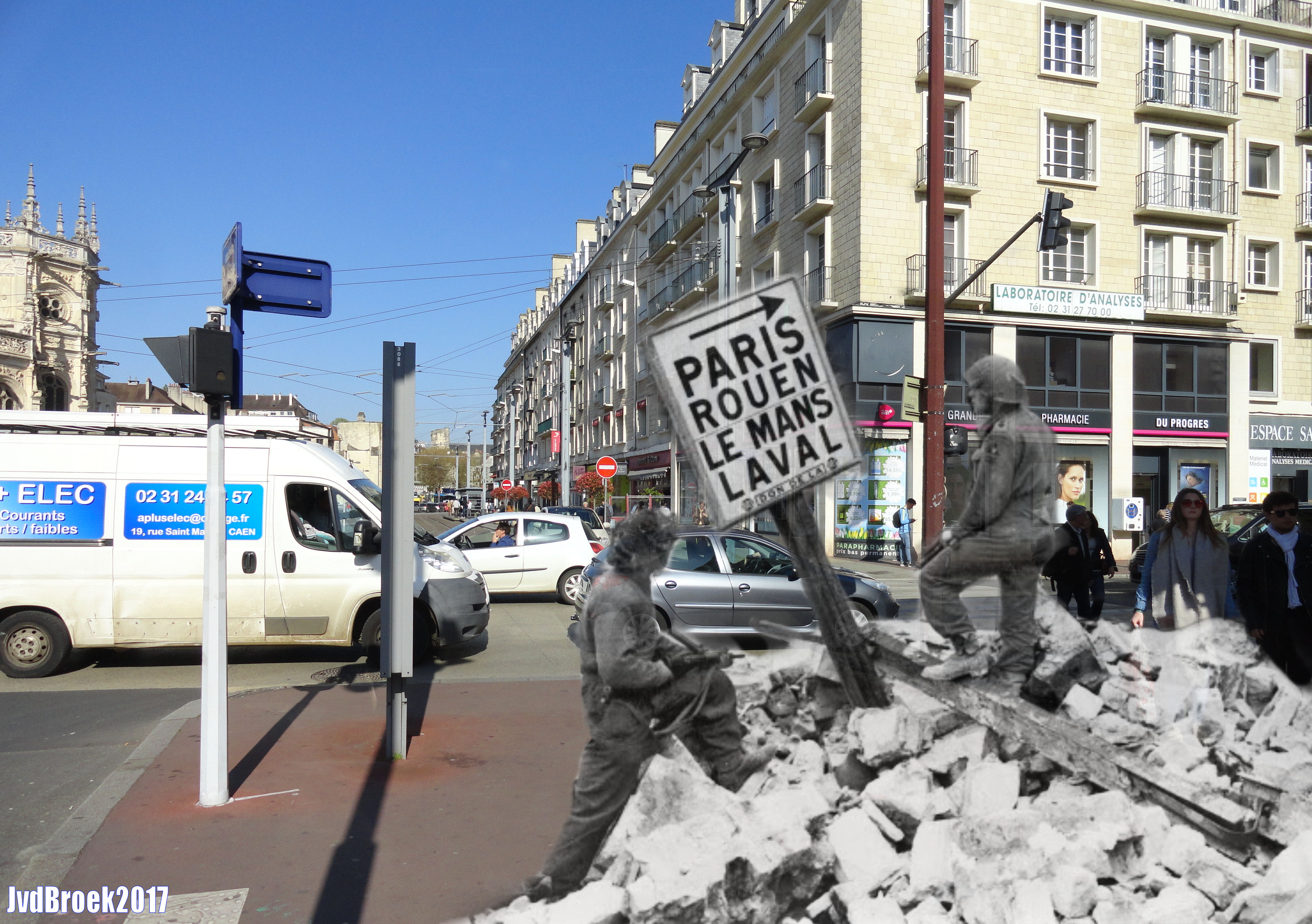A lieutenant and another soldier of the Royal Ulster Rifles observe a roadsign among the ruins of Caen in 1944.