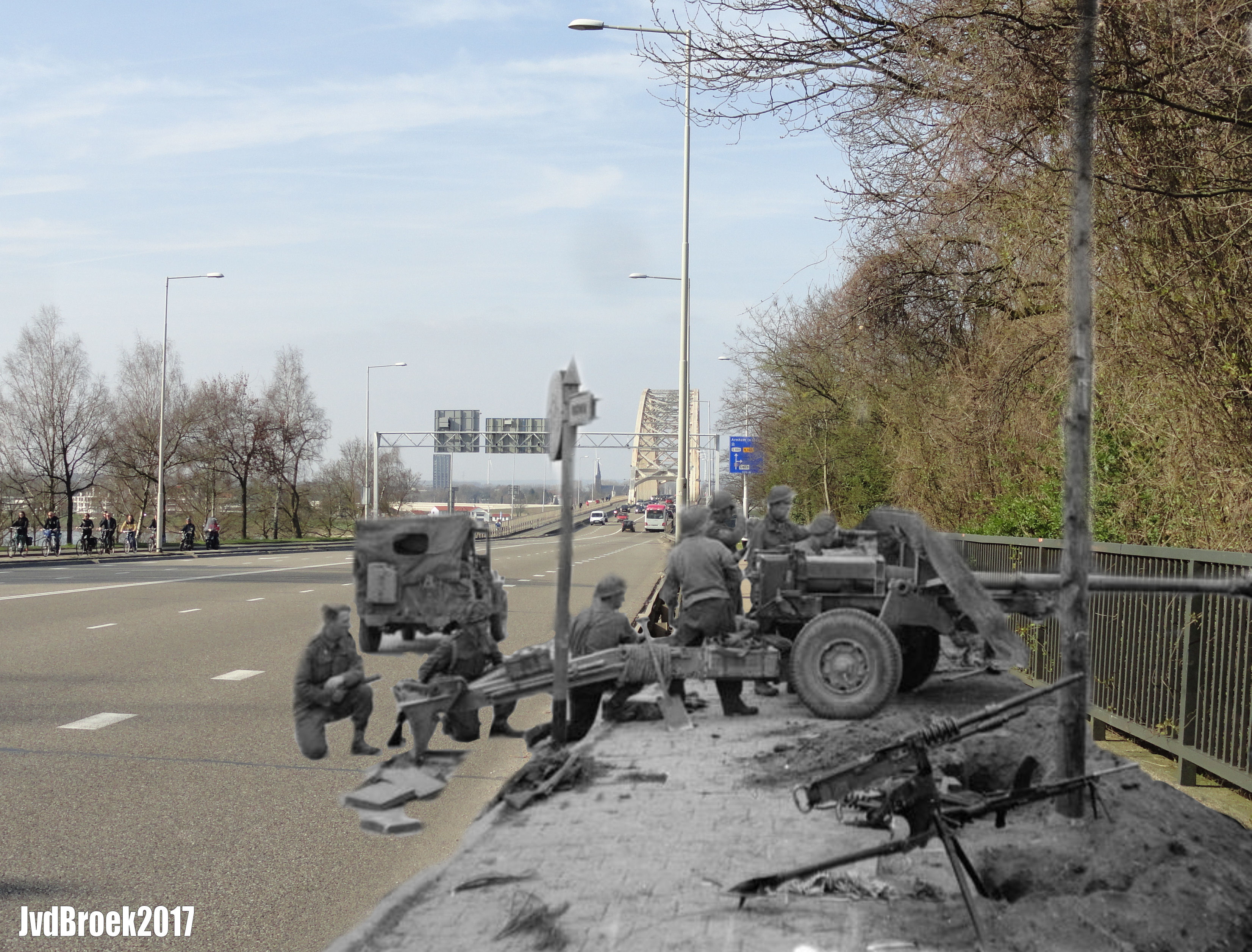 17-pdr anti-tank gun of the 21st Anti-Tank Regiment, Guards Armoured Division, guards the approaches to Nijmegen Bridge, 21 September 1944.