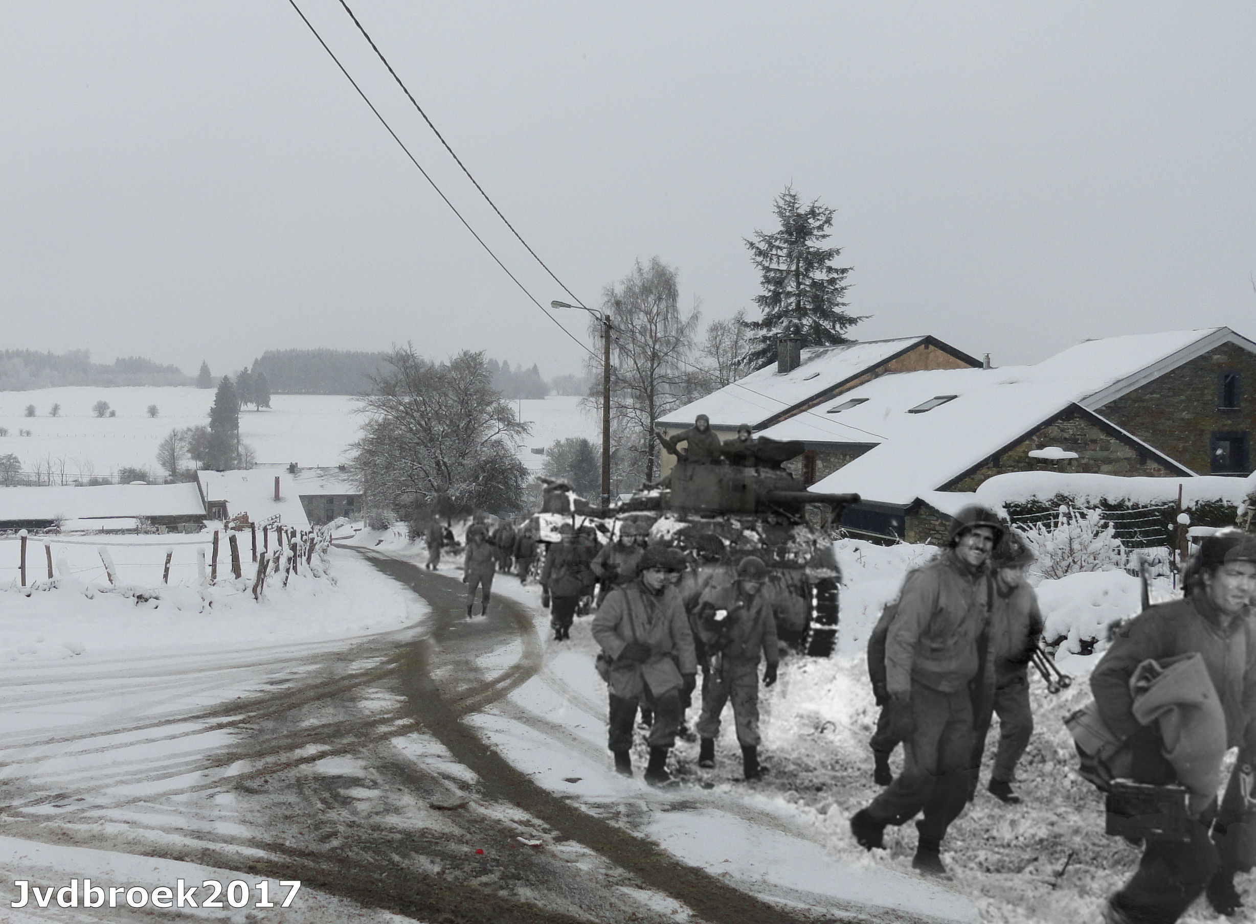 American reconnaissance troops, of the 87th infantry divisions, move up the main street of Bihain, Belgium to attack german troops “dug in” in the woods beyond the town, 11 January 1945
