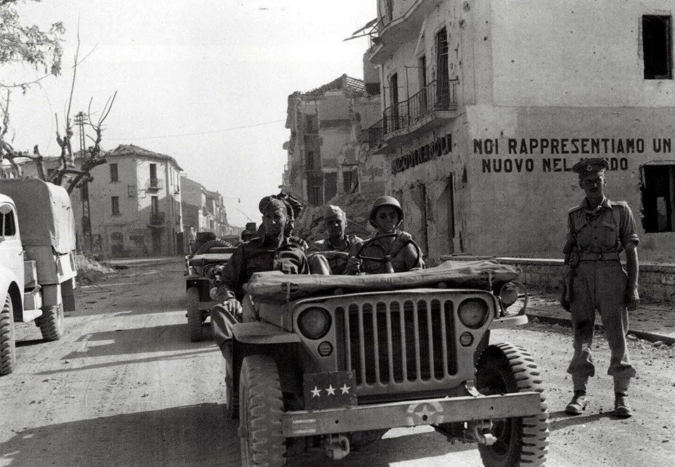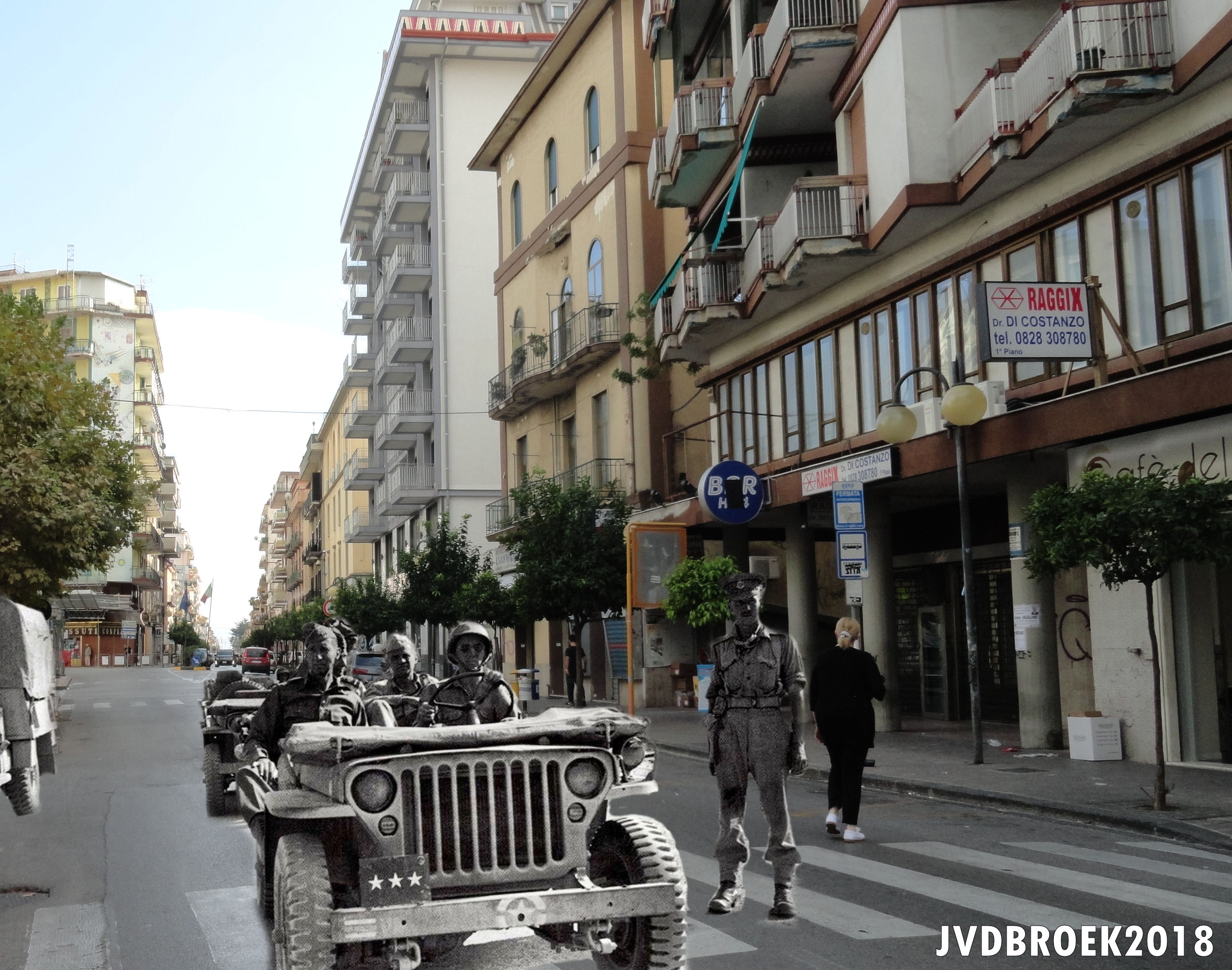 Two days after taking Battipaglia, Italy, the commander of Operation Avalanche, General Clark visited the town with airforce commander of the Middle Sea General Sir Arthur Tedder. Check the yellow building, that’s the connection with the past.
