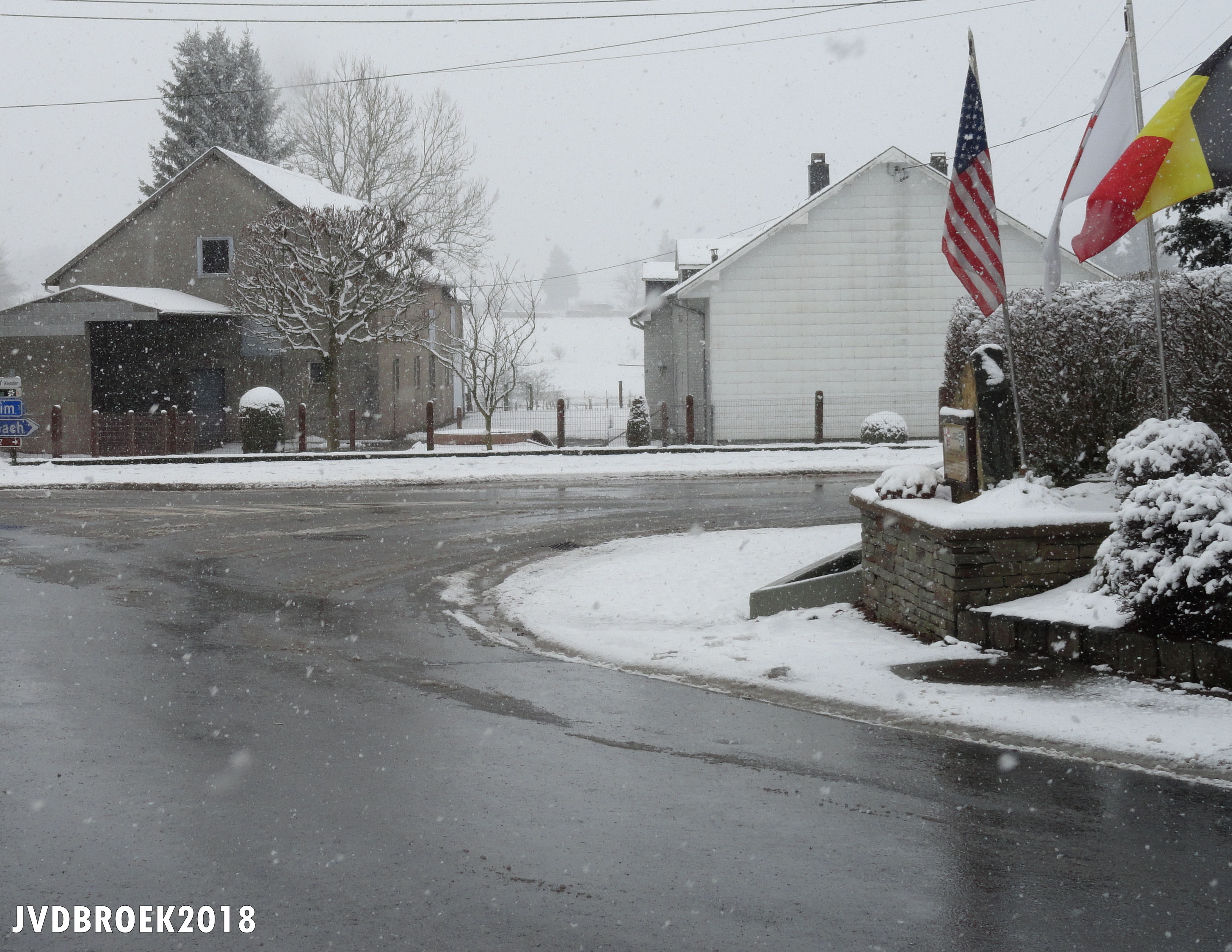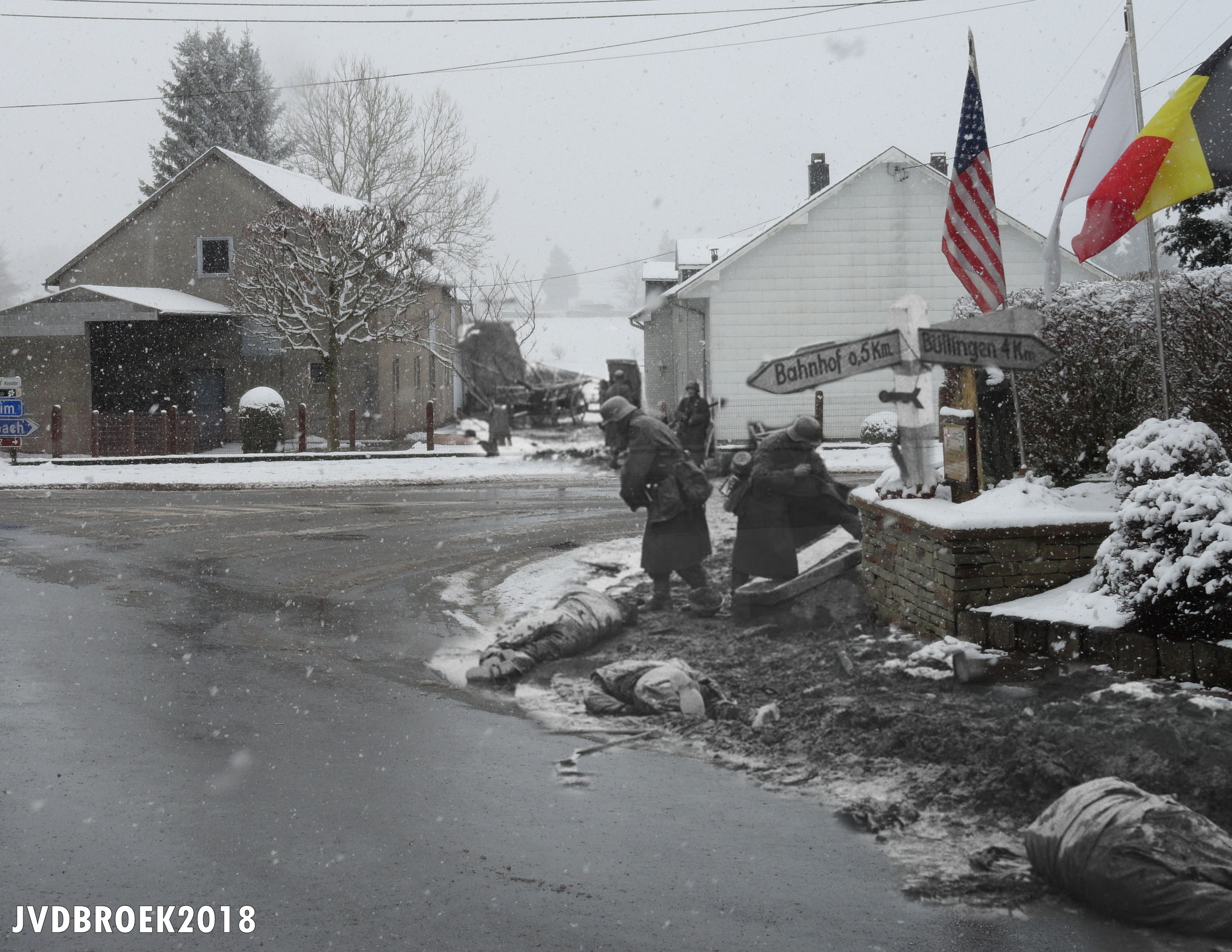 Troops of the 12th Volksgrenadier Division strip boots and other equipment from the bodies of dead U.S. soldiers at the crossroads at Honsfield, Belgium, west of Losheimergraben.