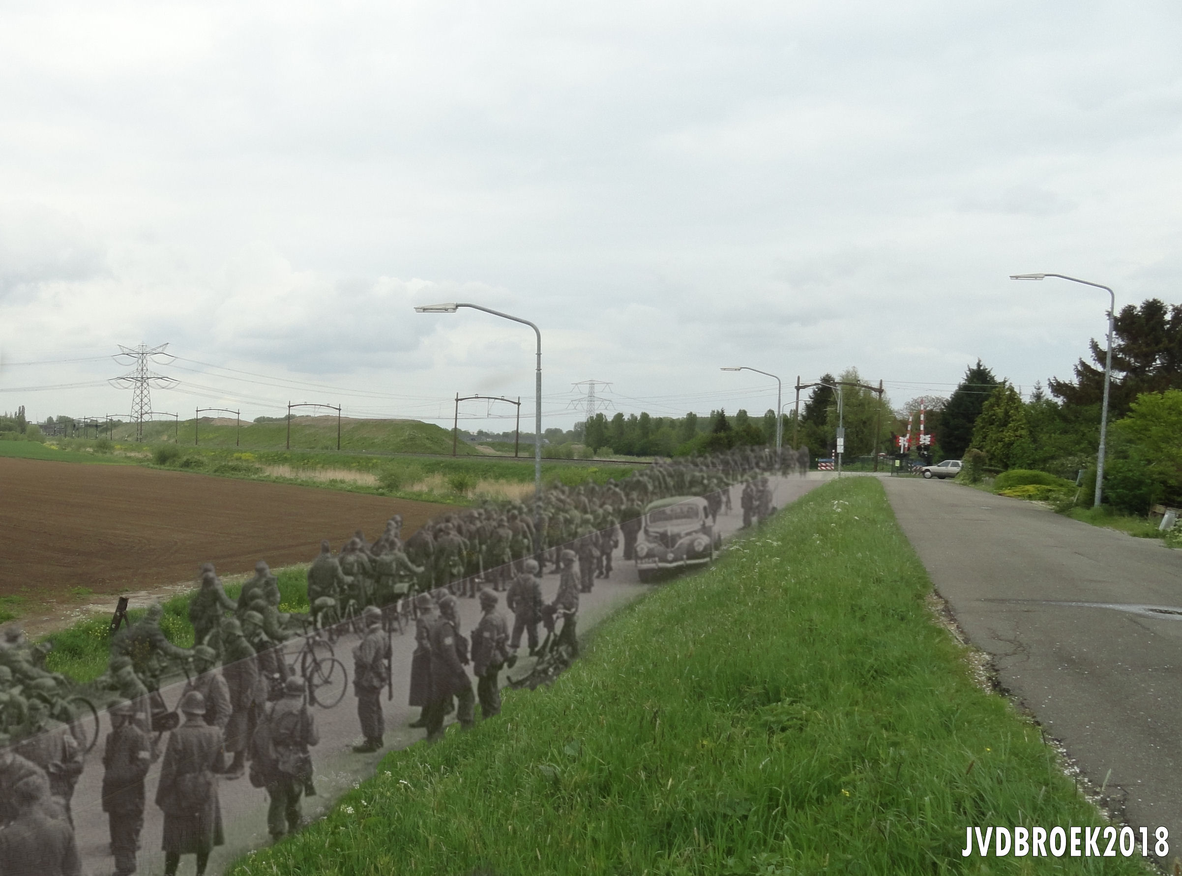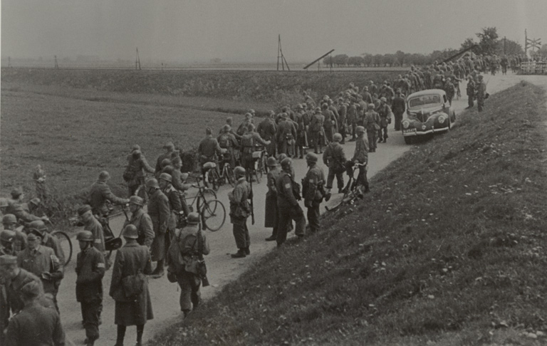 Captured Dutch soldiers are collected under the supervision of German parachutists near the crossing of the Tweede Tol, Dordrecht, 1940.