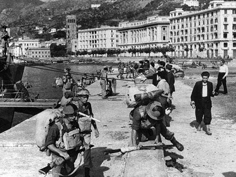 While disembarkation on the beaches continued, some ships dared to sail directly to the port of Salerno in 1943. Here soldiers entering the boulevard Lungomare Trieste.