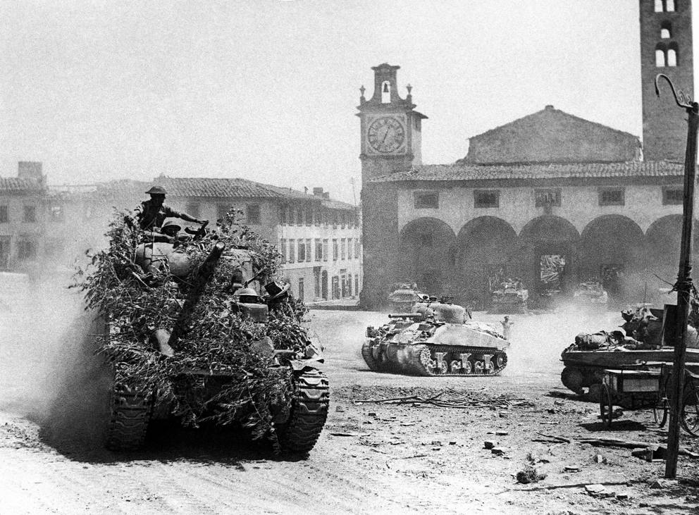 Tanks move through the Italian town of Imprunetta during advance to Florence 1944.