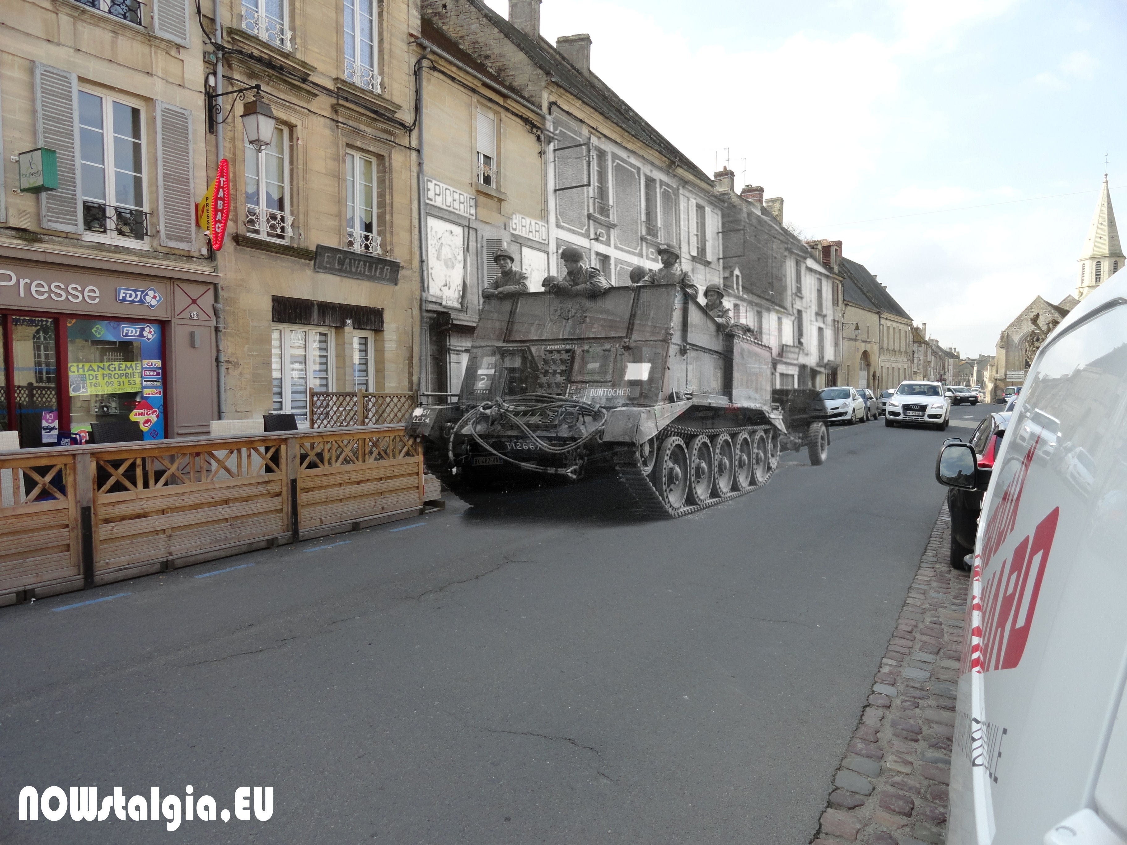 A #crusader gun tractor in the streets of #Creully, #Normandy in 1944.
