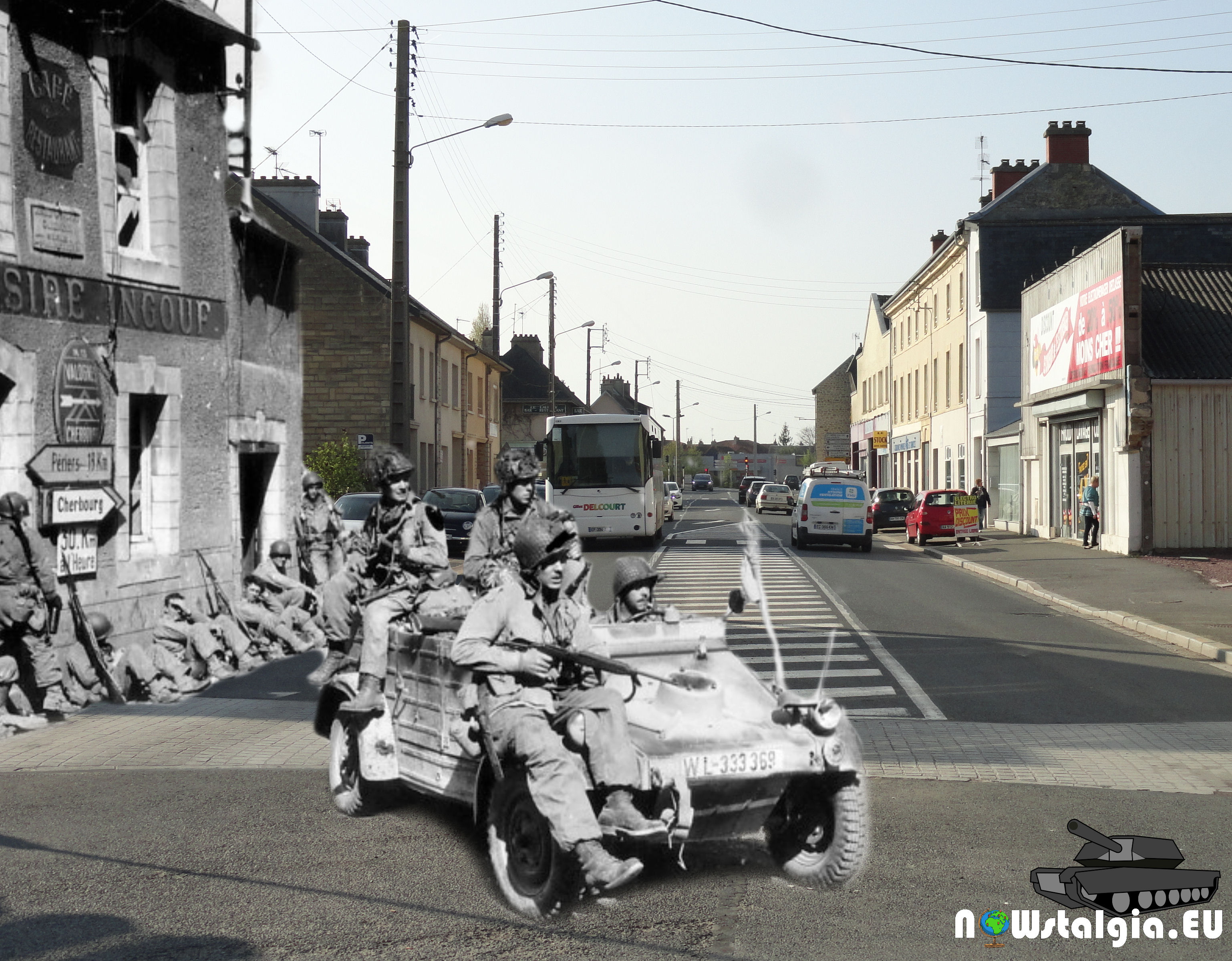 Soldiers of the 101st Airborne Division in Carentan, 1944 at the junction of Rue Holgate and Rue 101ème Airborne.