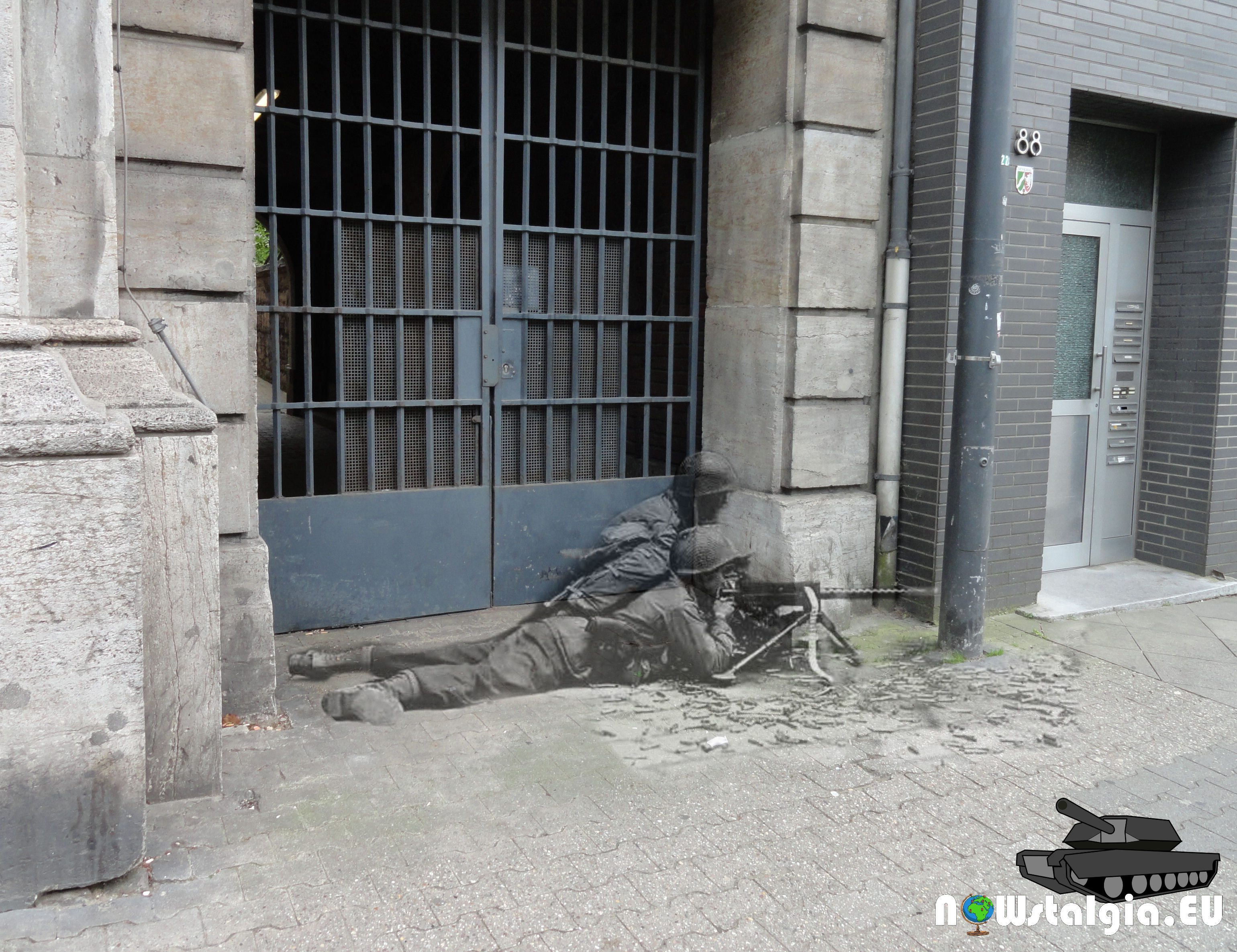 American soldiers during the Battle of Aachen before the Courthouse at the Adalbertsteinweg in 1944.