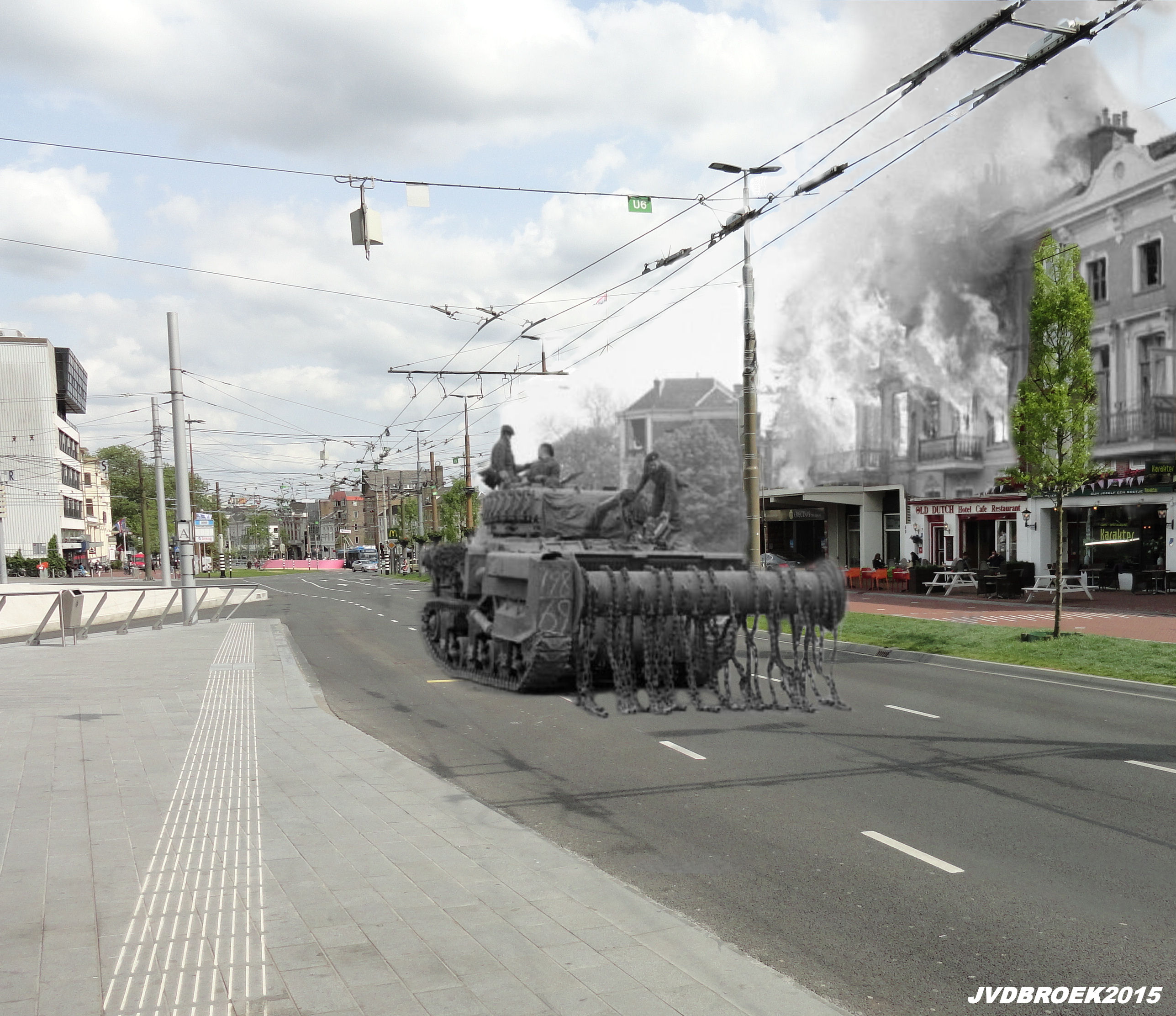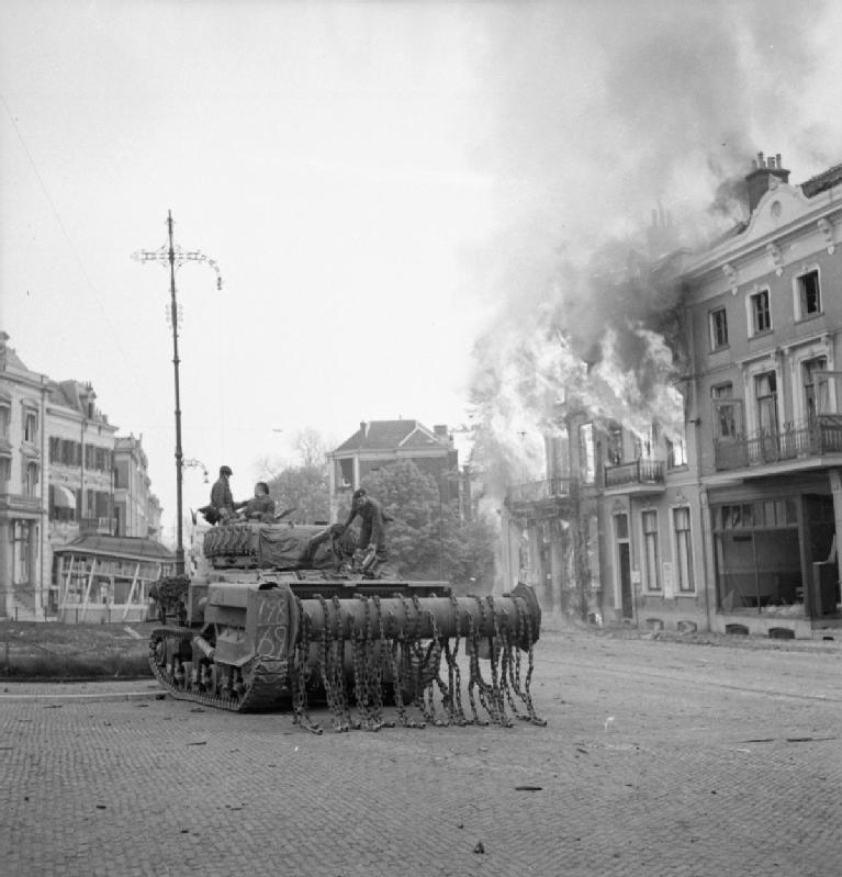 A Sherman Crab flail tank before central station in Arnhem, 14 April 1945.