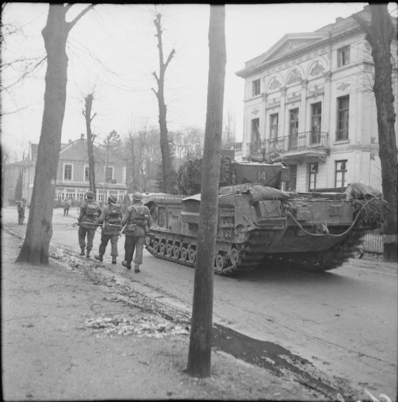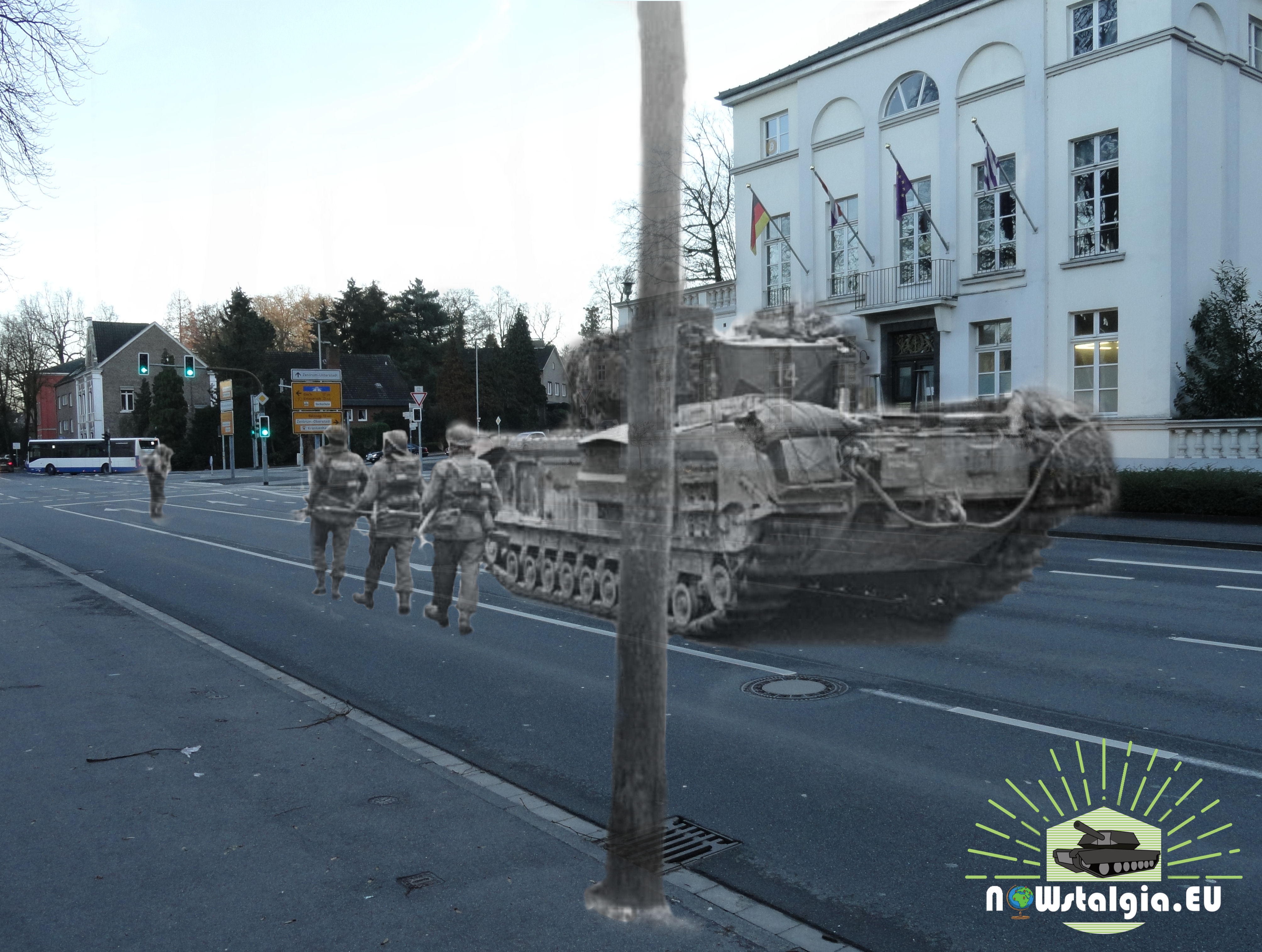 Kleve – Tiergartenstraße (1) Posted on January 3, 2019 by Adm.CorSleutel Churchill tank of 6th Guards Tank Brigade and infantry of the 2nd Gordon Highlanders in Kleve, 11 February 1945. Then image: © IWM (B 14601) Now image: www.nowstalgia.eu / Cor Sleutel