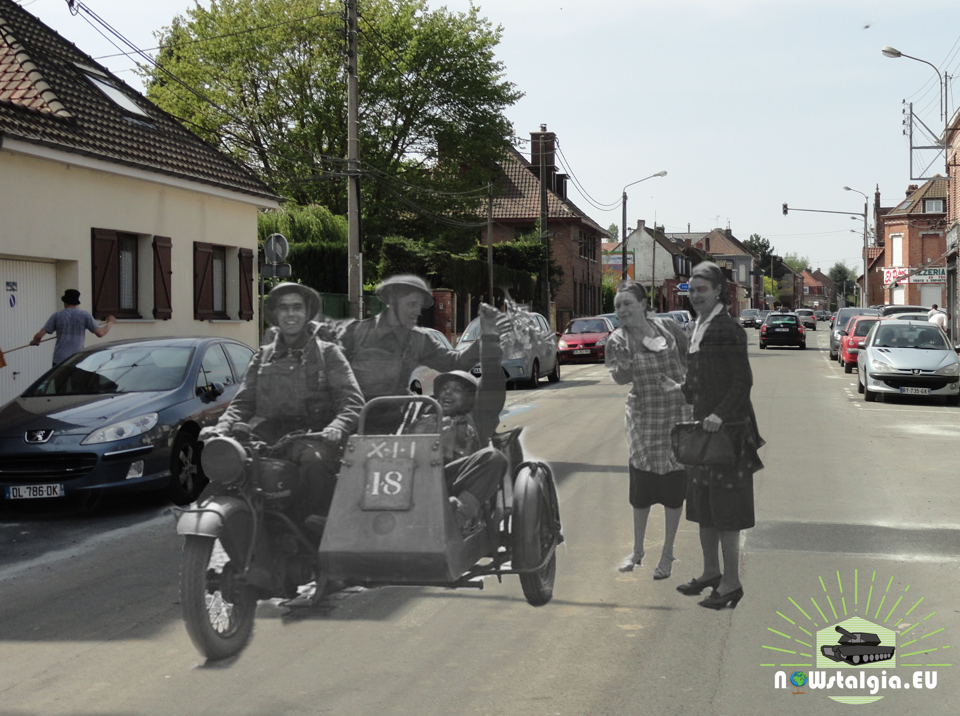 Belgian girls give flowers to British troops riding a Norton motorcycle combination in Herseaux, as the BEF crosses the border into Belgium, 10 May 1940.
