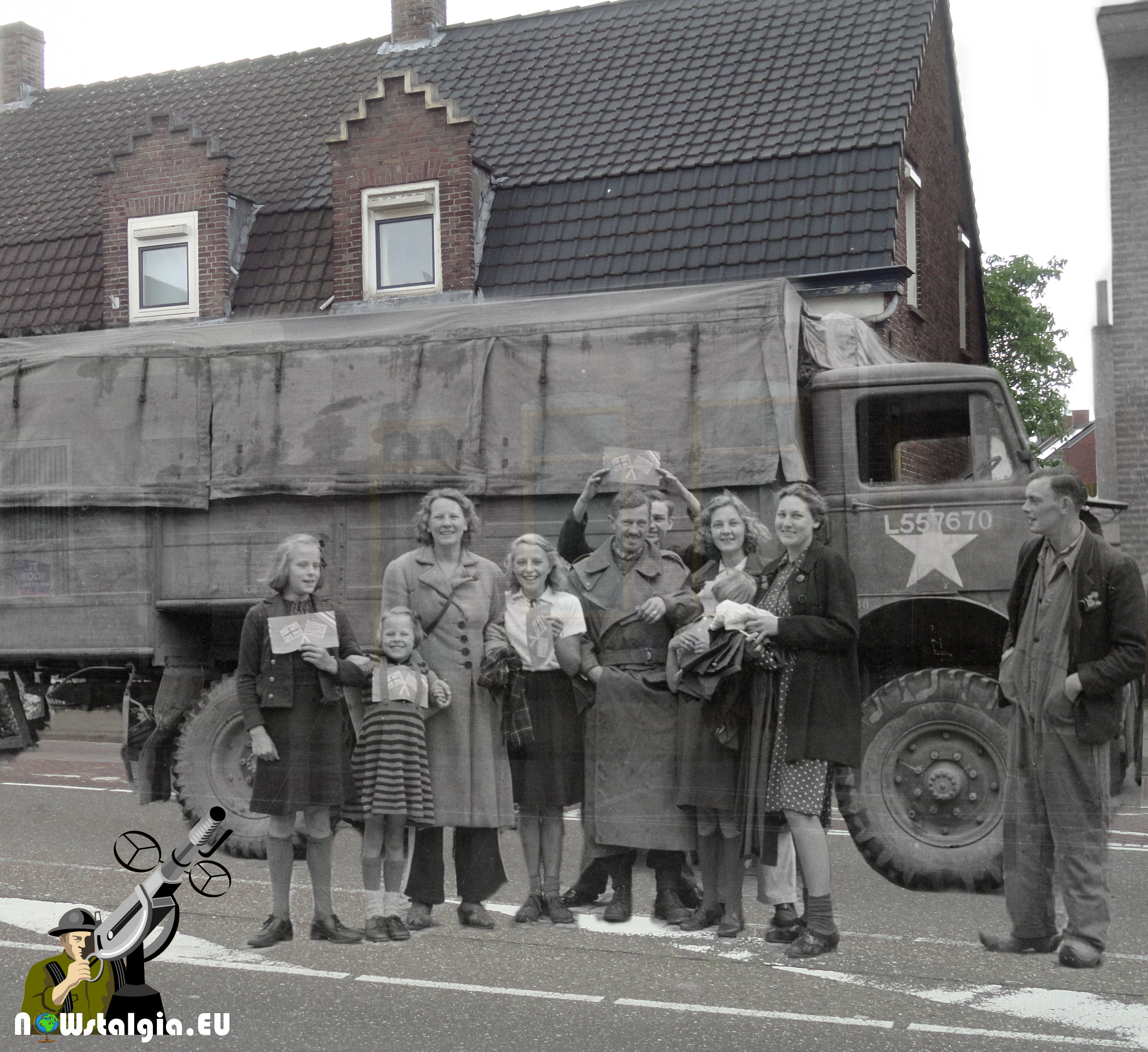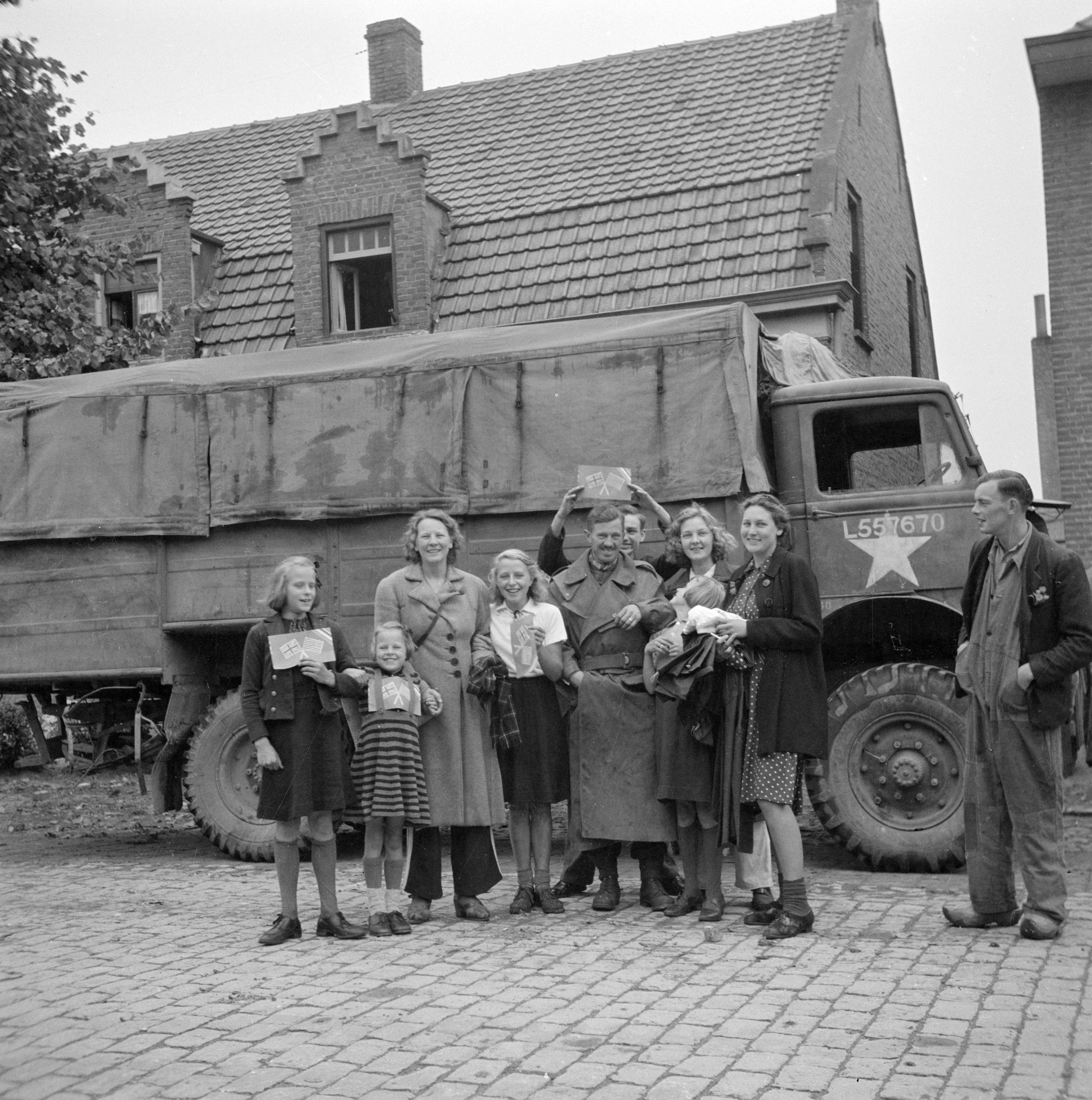 More people of Aalst posing with a soldier of the Irish Guards at 18 September 1944.