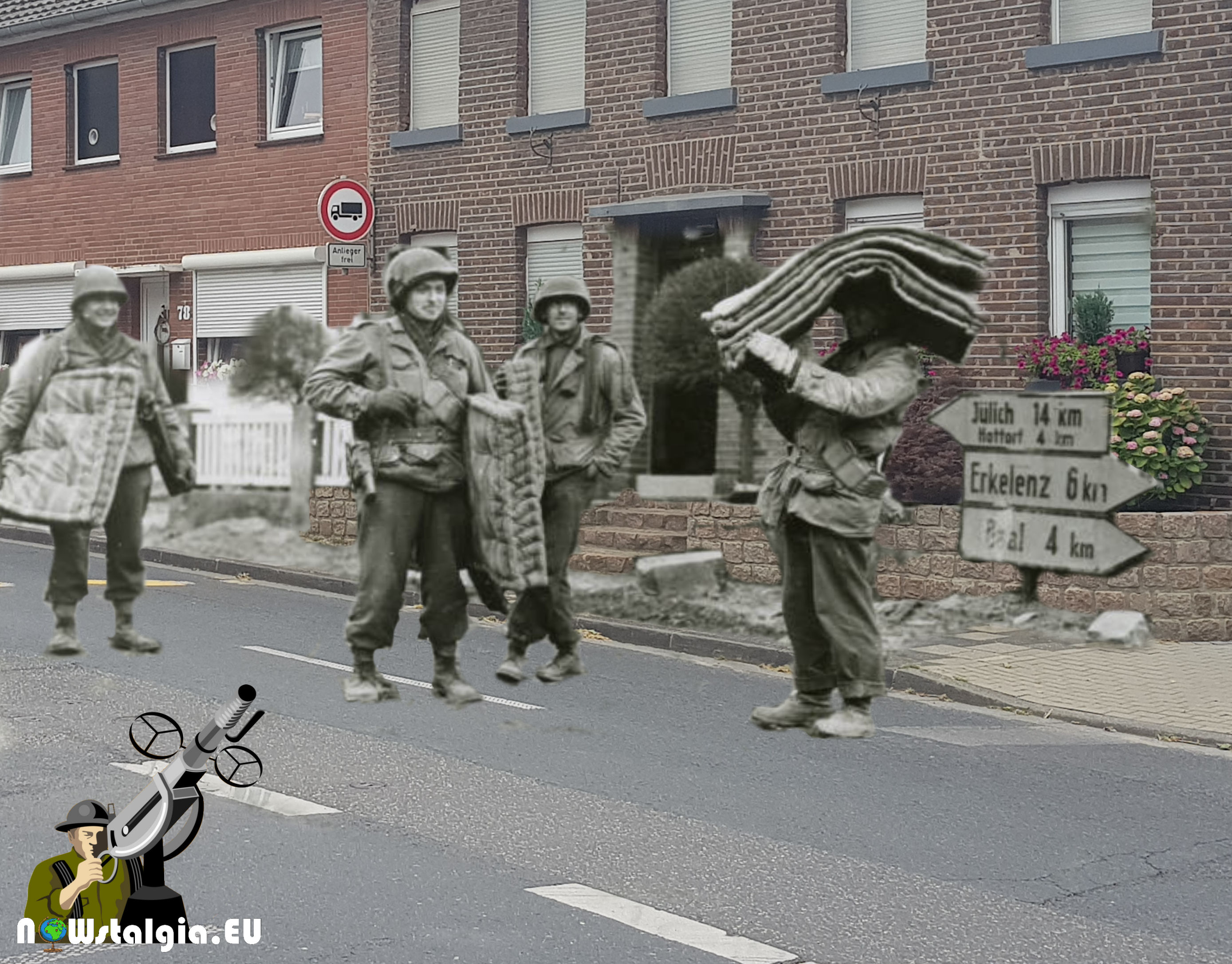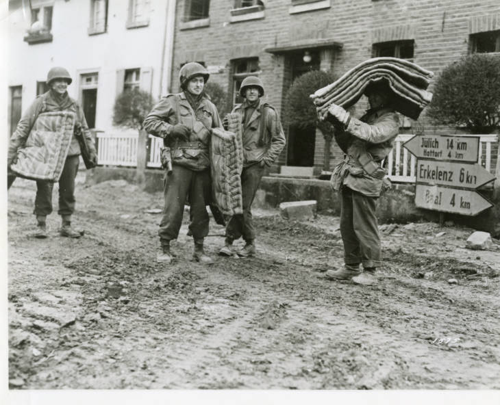 US soldiers collect mattresses in a German town of Lovenich, 1945