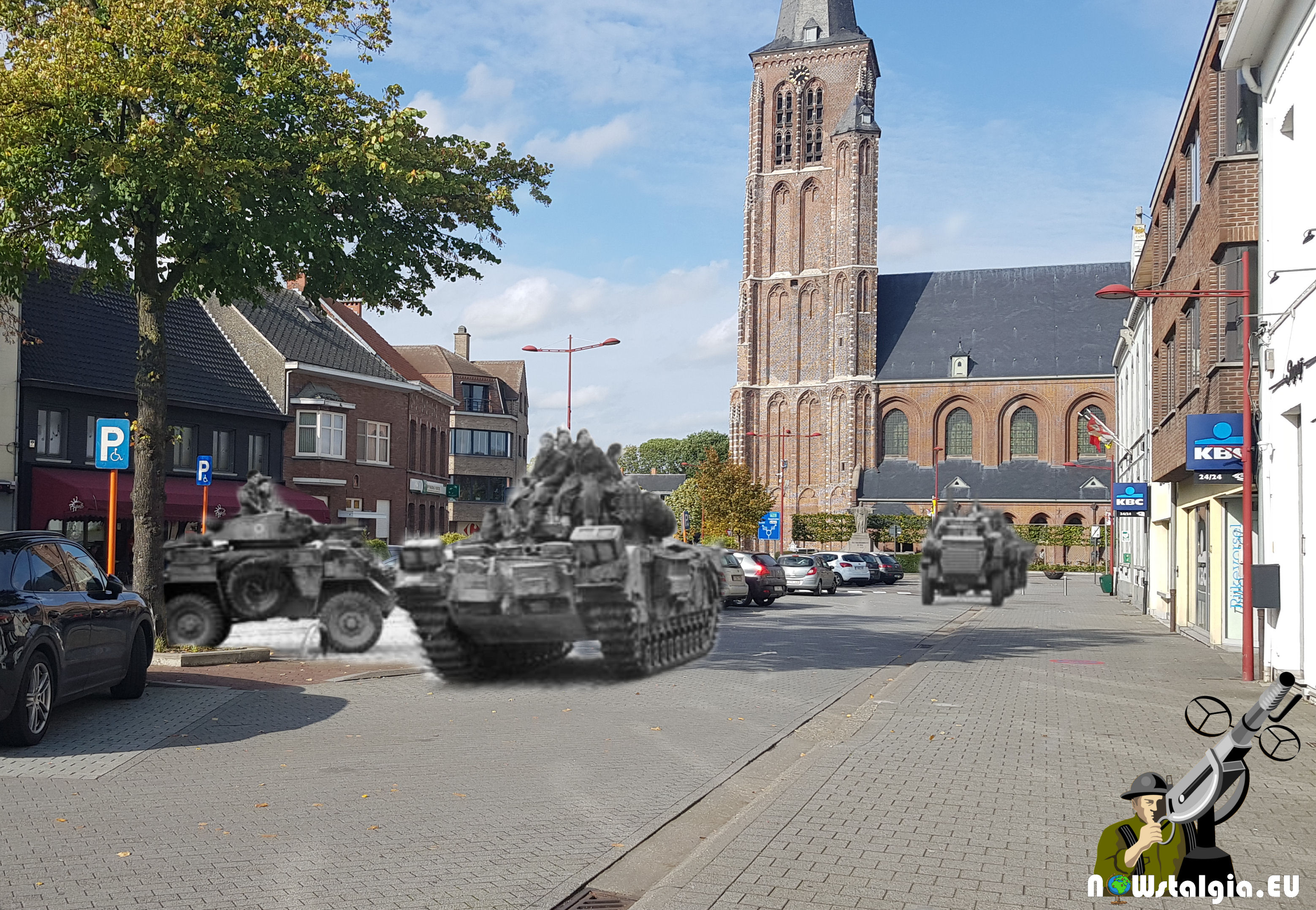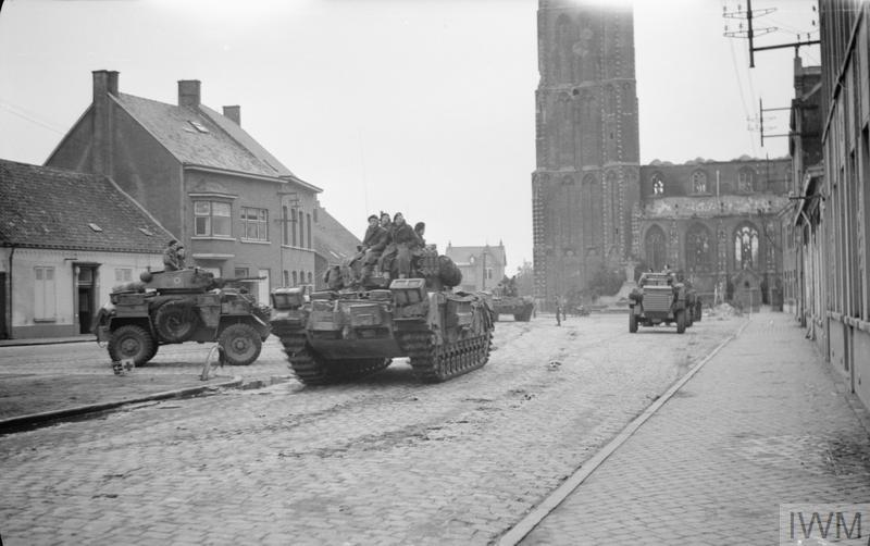 Churchill tanks and Humber armoured cars in Rij(c)kevorsel during the attack by 34th Armoured Brigade north of Antwerp, 22 October 1944.