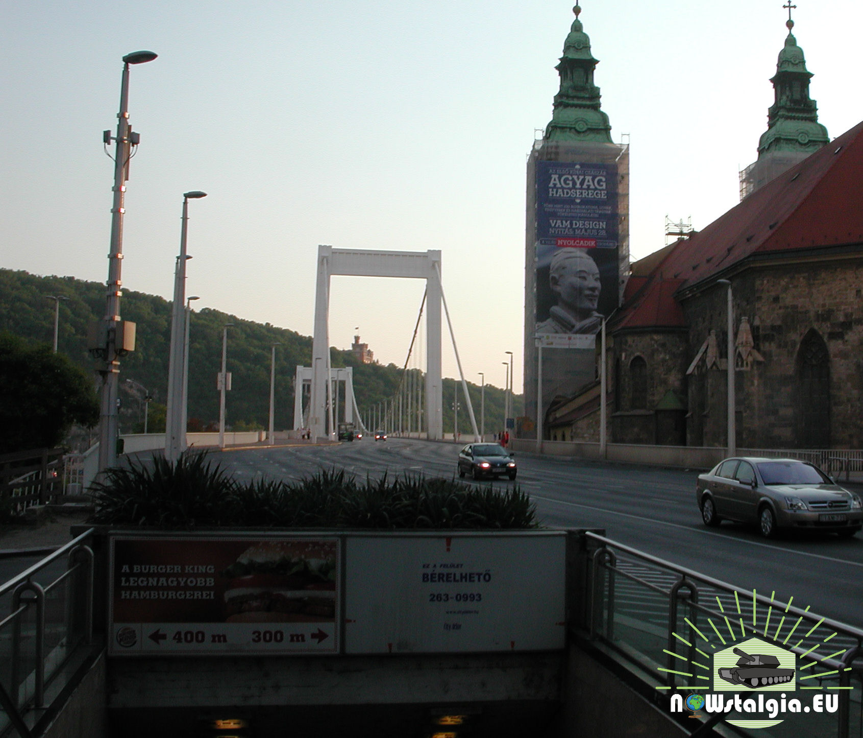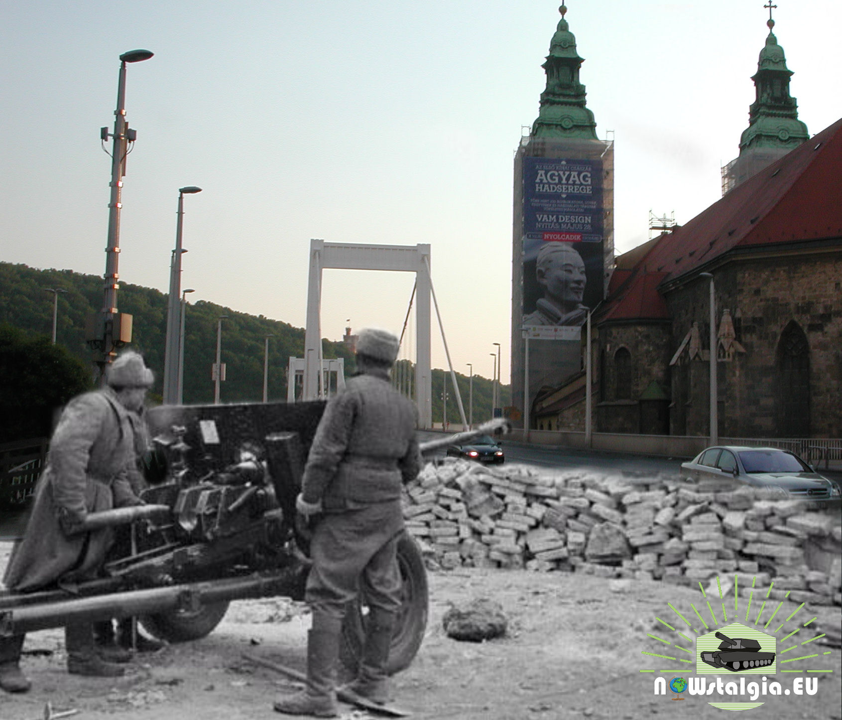 The wartime picture was not taken near the Liberty Bridge (Szabadság Híd), but rather on what is now Szabad Sajtó út (Free Press Road, on the Pest side of the river) looking toward the Erzsébet Híd (the Elizabeth Bridge).