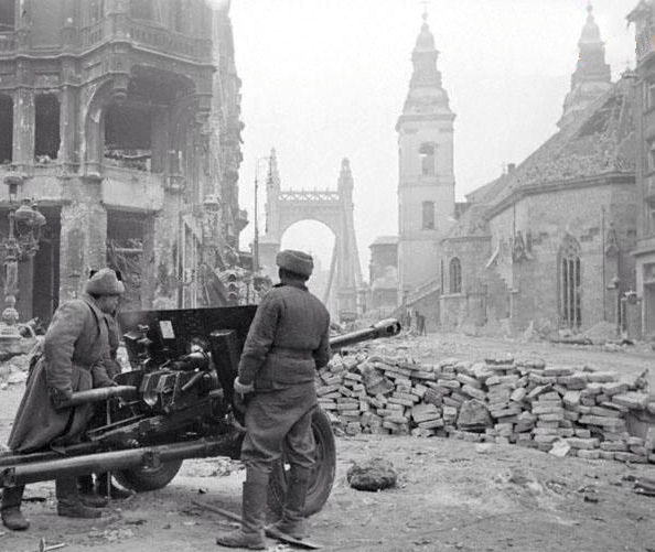Russian Soldiers in the city of Budapest near the Liberty bridge in 1944-1945.
