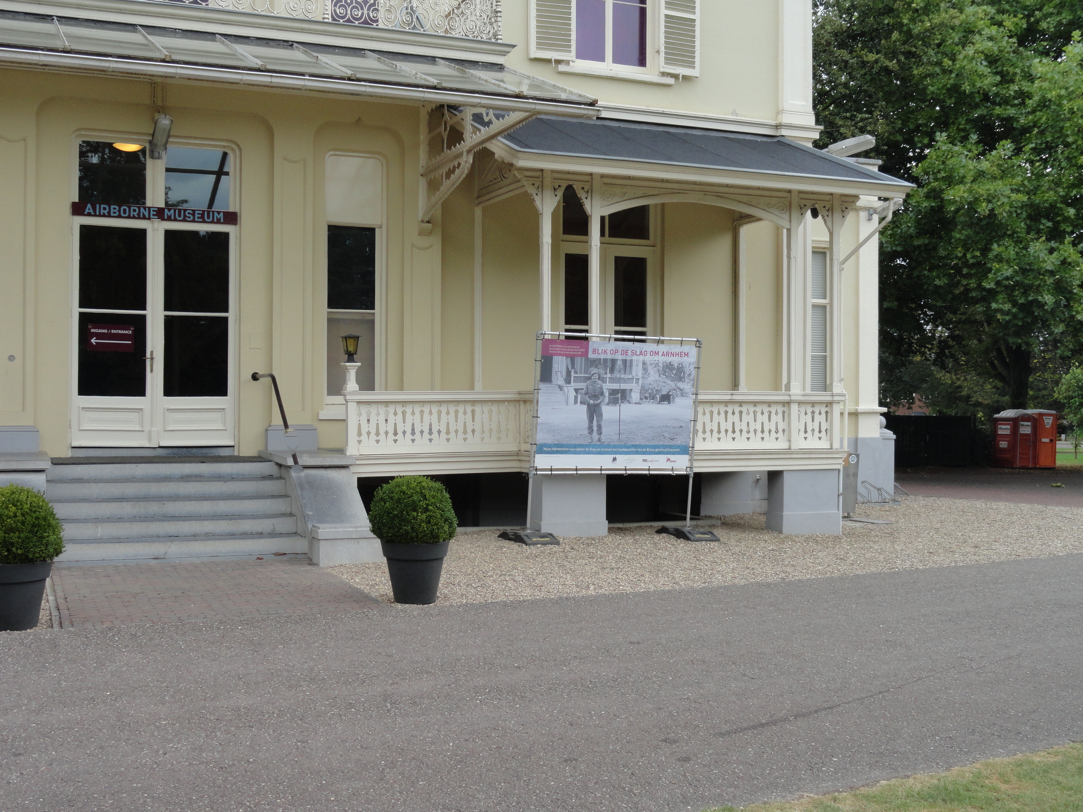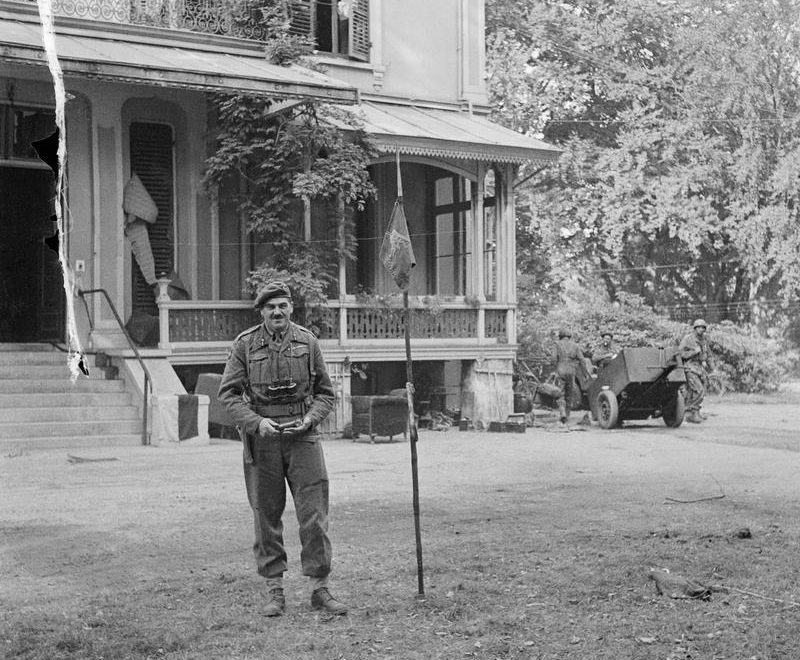 Major-General Robert E Urquhart, commanding 1st British Airborne Division, with the Pegasus airborne pennant in the grounds outside his headquarters at the Hartenstein Hotel in Oosterbeek, 22 September 1944.
