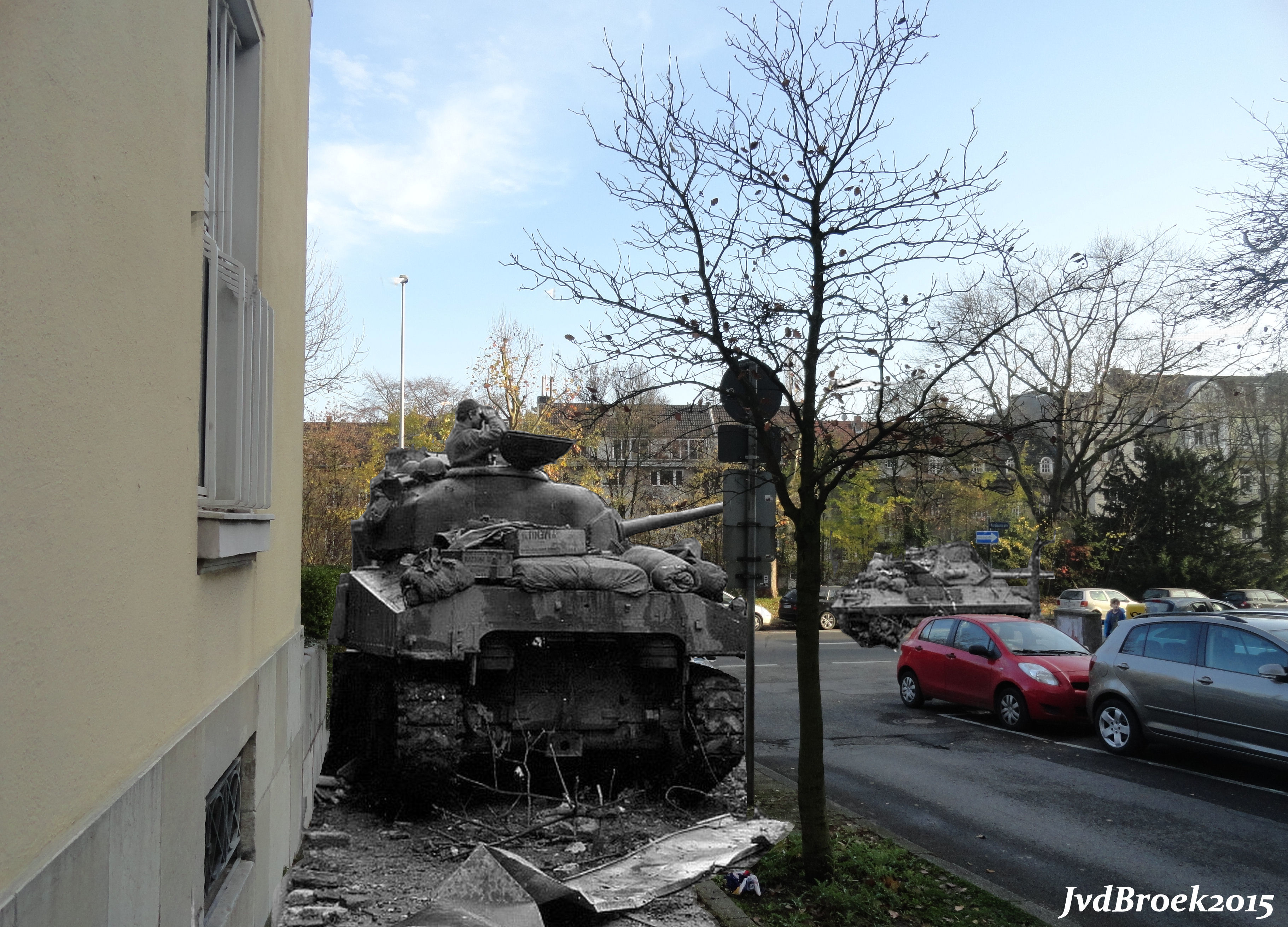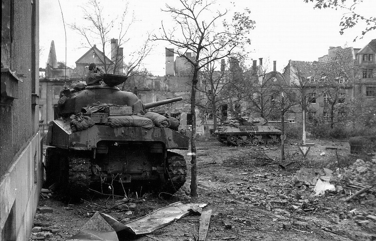 Sherman tank and M10 tank destroyer on the streets of Aachen, October 1944.