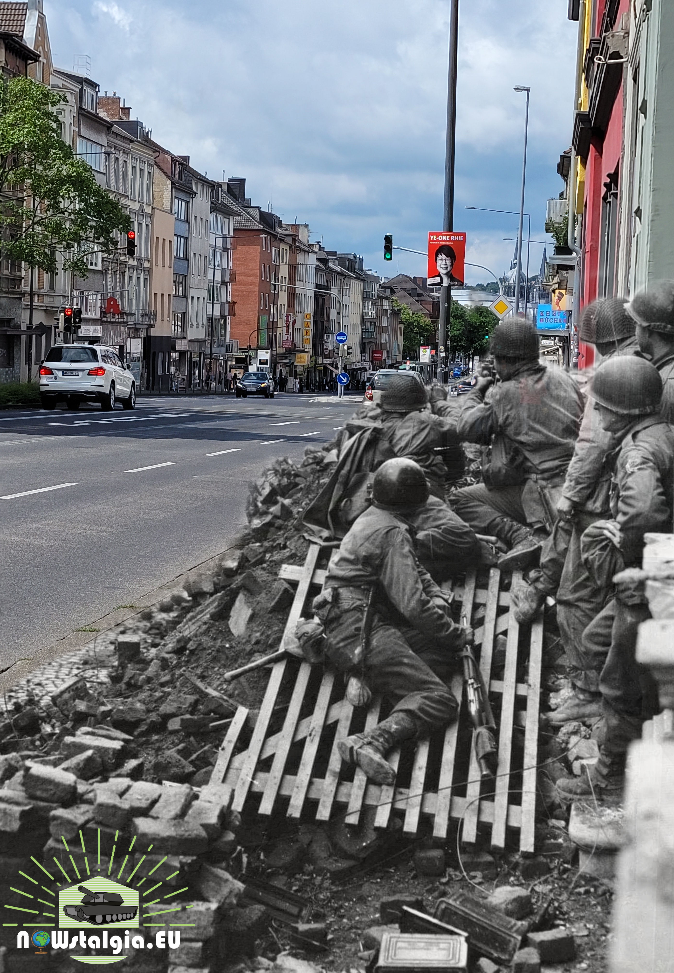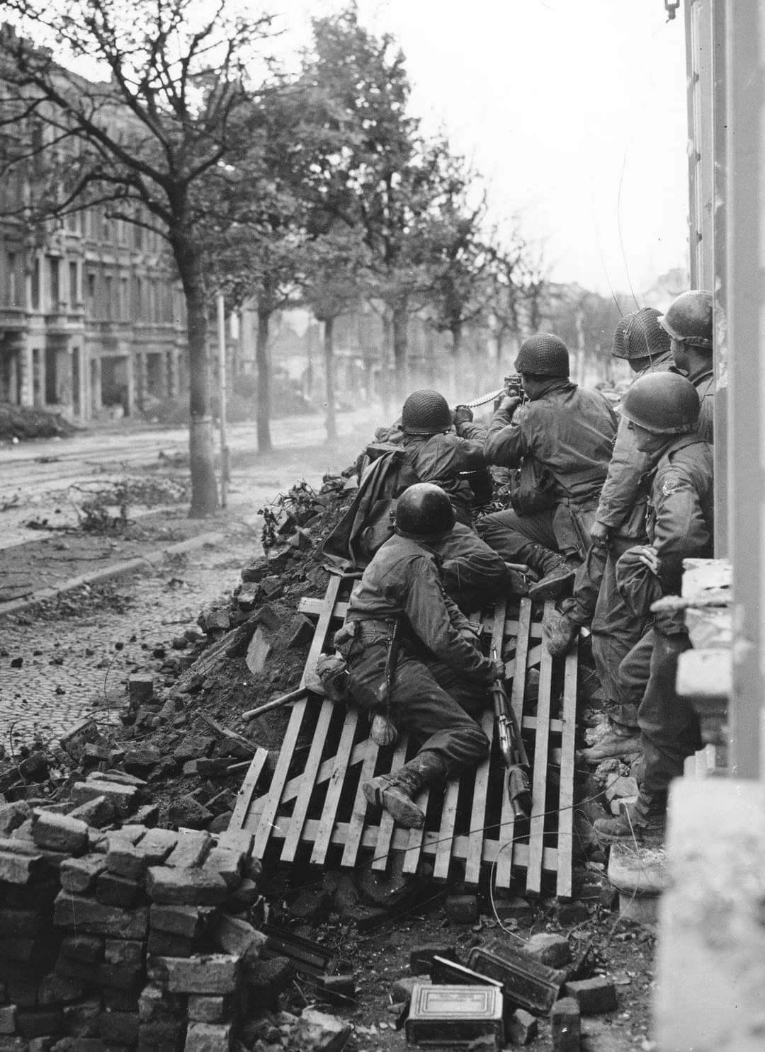 American machine gunners fire down the Adalbertsteinweg in Aachen during the attack of the city in 1944.