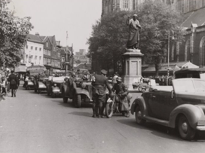 Duitse Bezetting 1940-1945, Duitse intocht. Aankomst van de Duitse troepen op de Grote Markt, ziende naar de oosten.