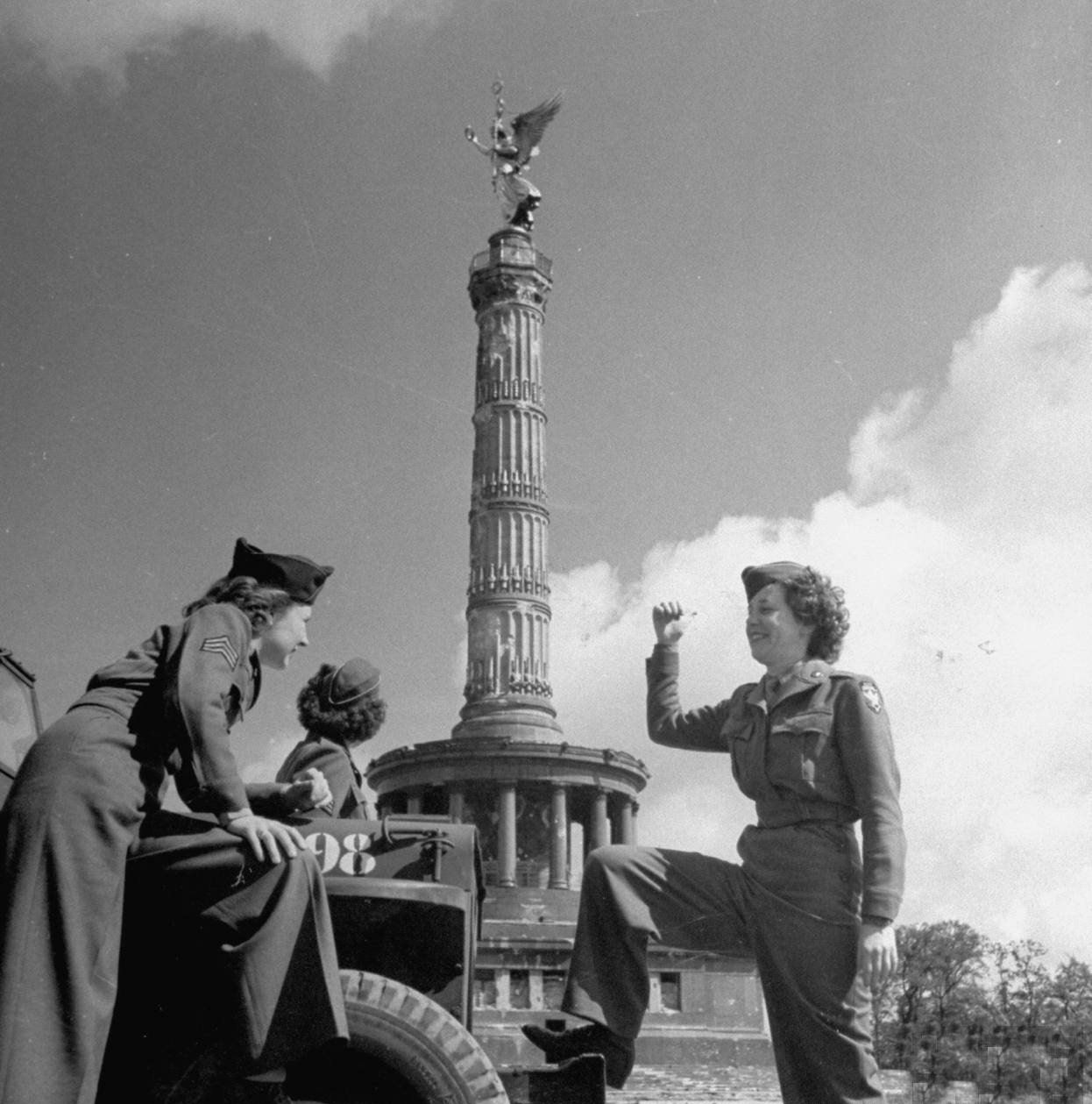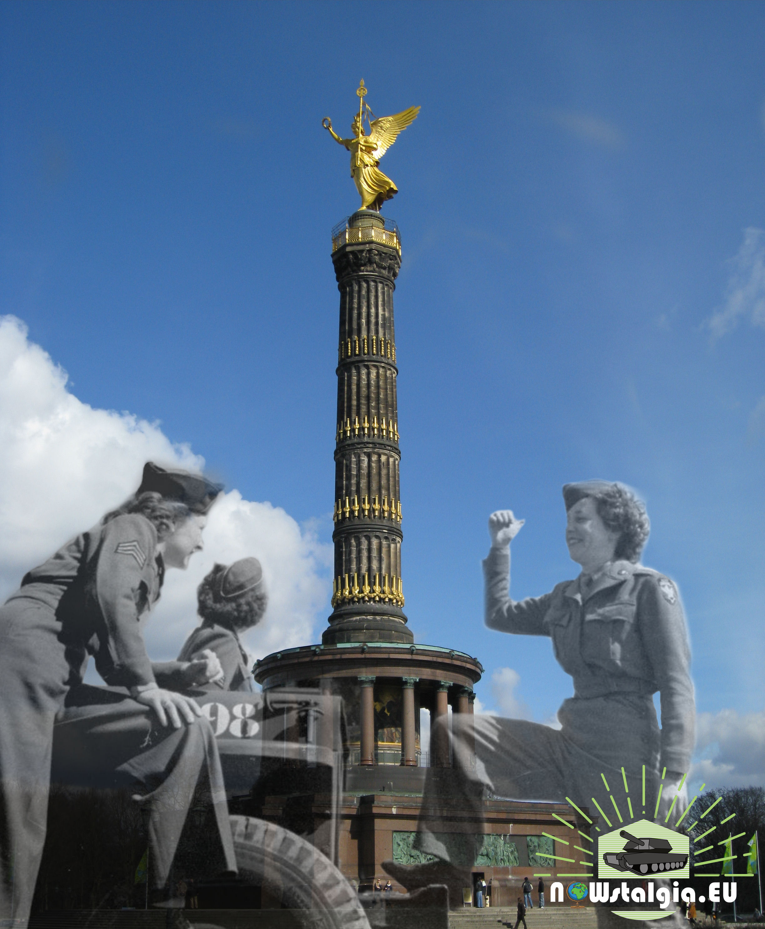 Woman in the US-Army in front of the Siegessaule, Berlin acting like tourist in Berlin in the year 1945.