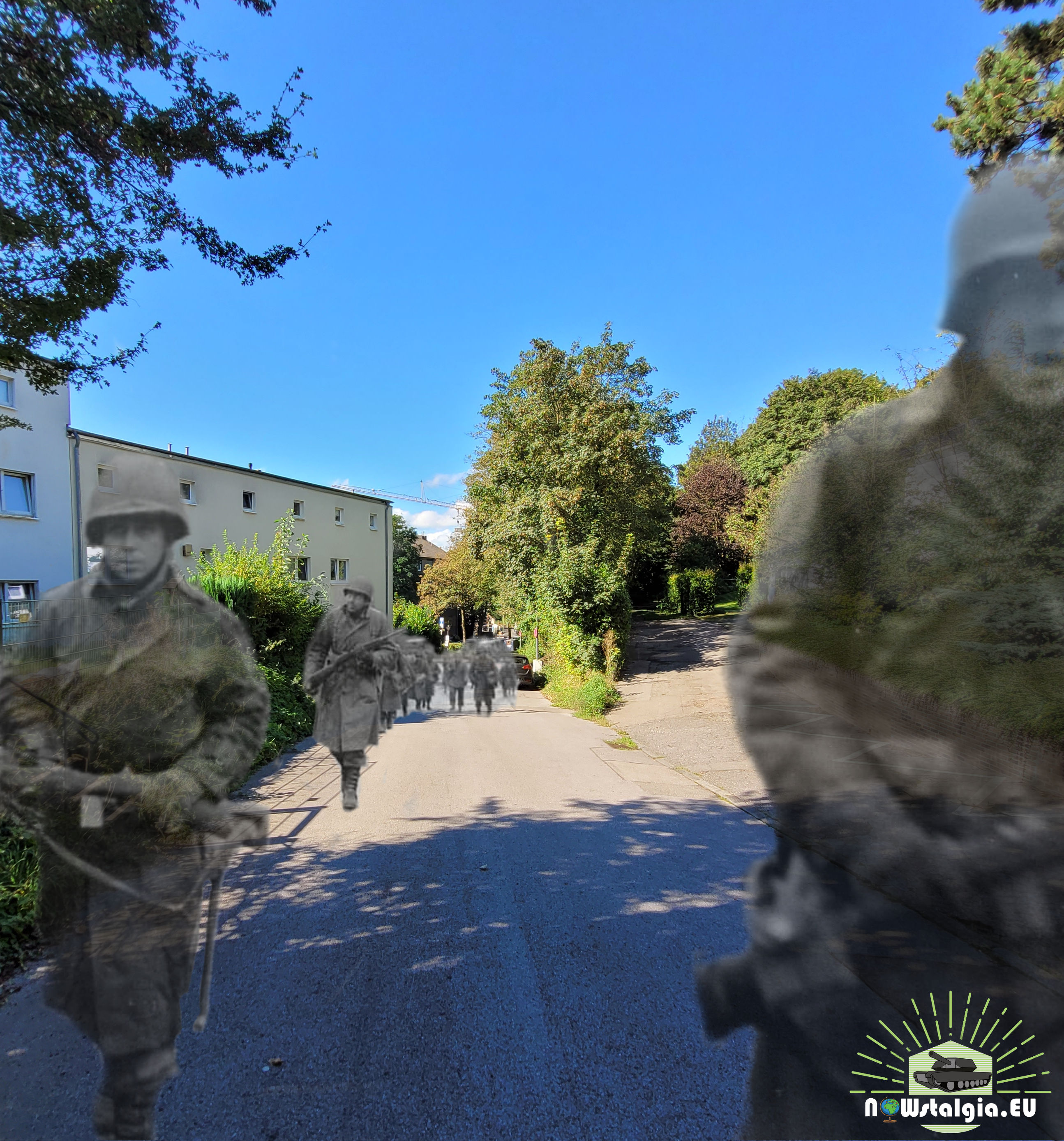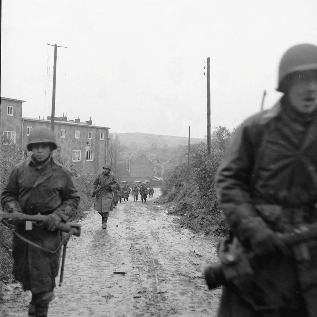 Soldiers of the US 104th Infantry Division “Timberwolves leaving the city center of Stolberg in November 1944.