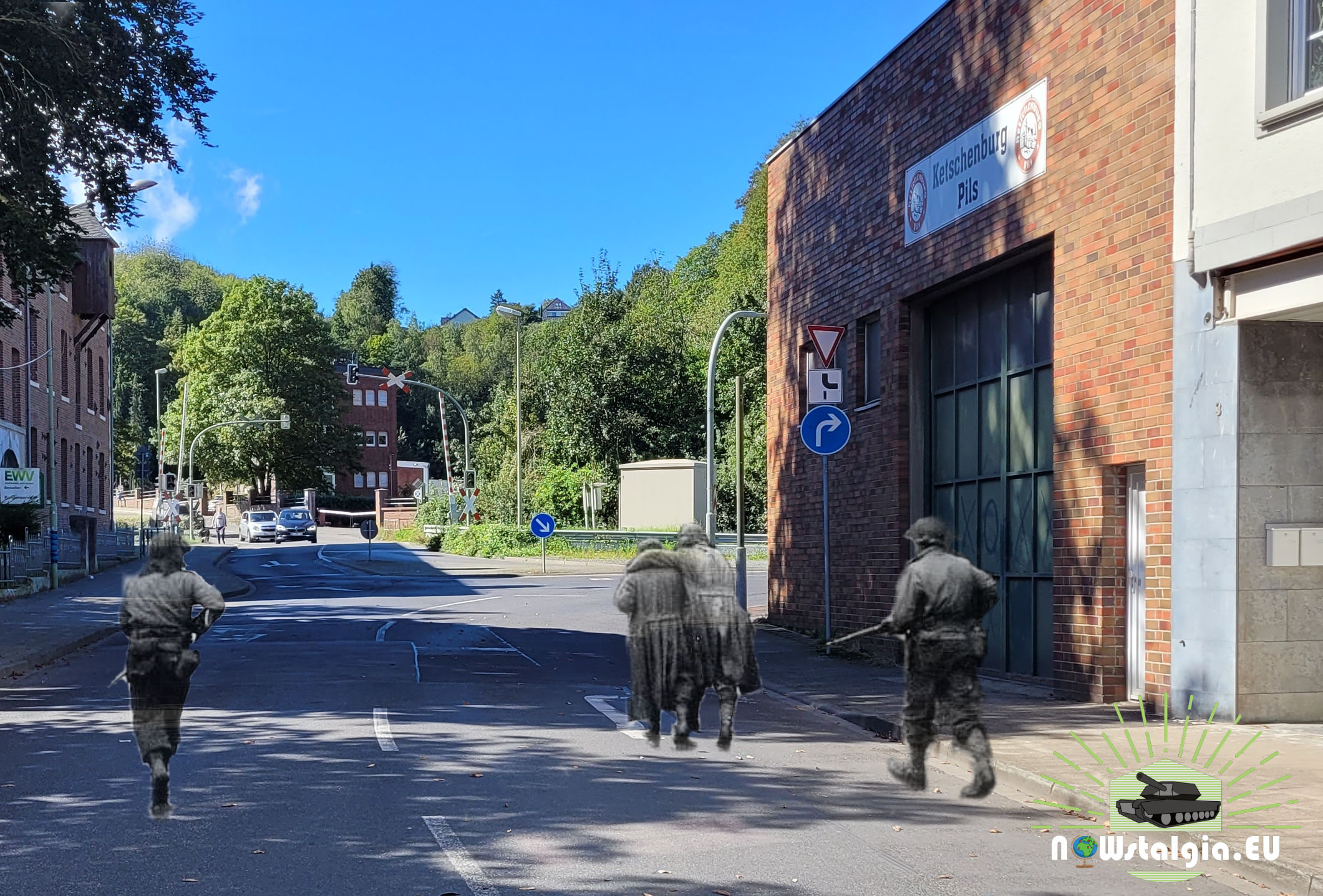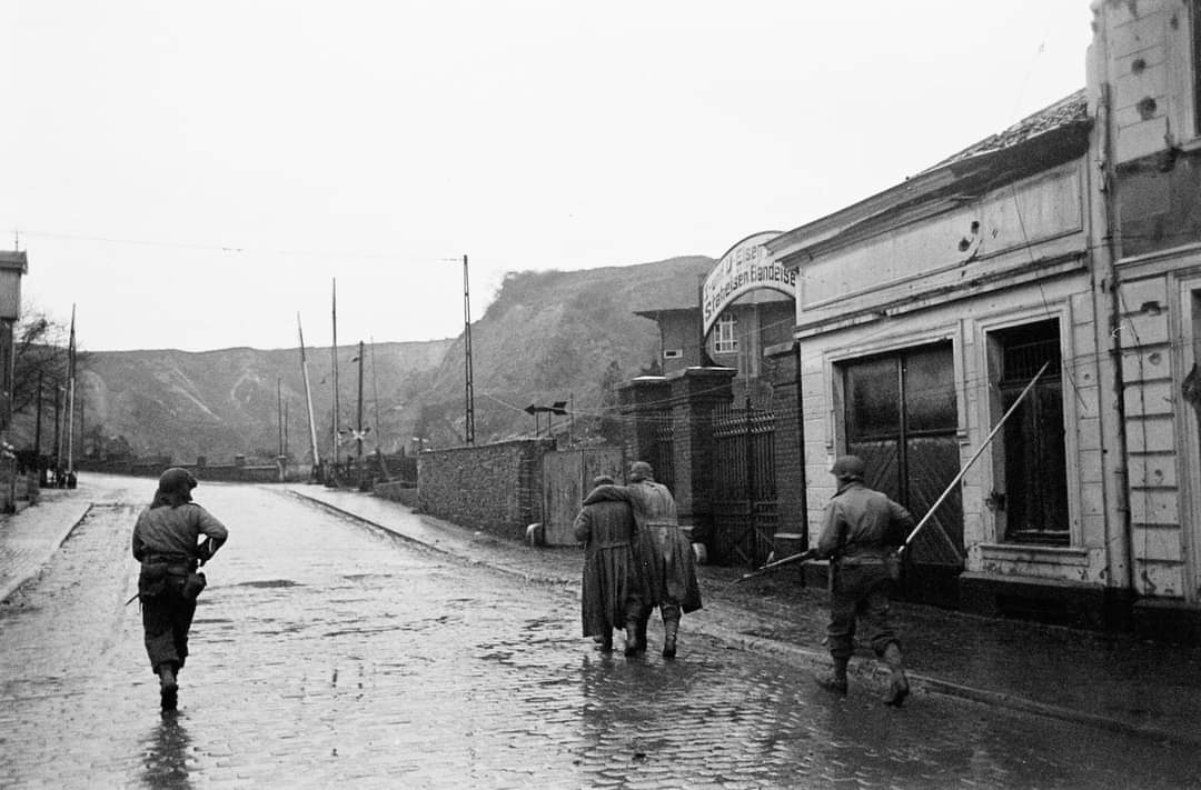Soldiers from the US 104th Infantry Division “Timberwolves” with 2 injured German Soldiers in the city center of Stolberg, November 1944.