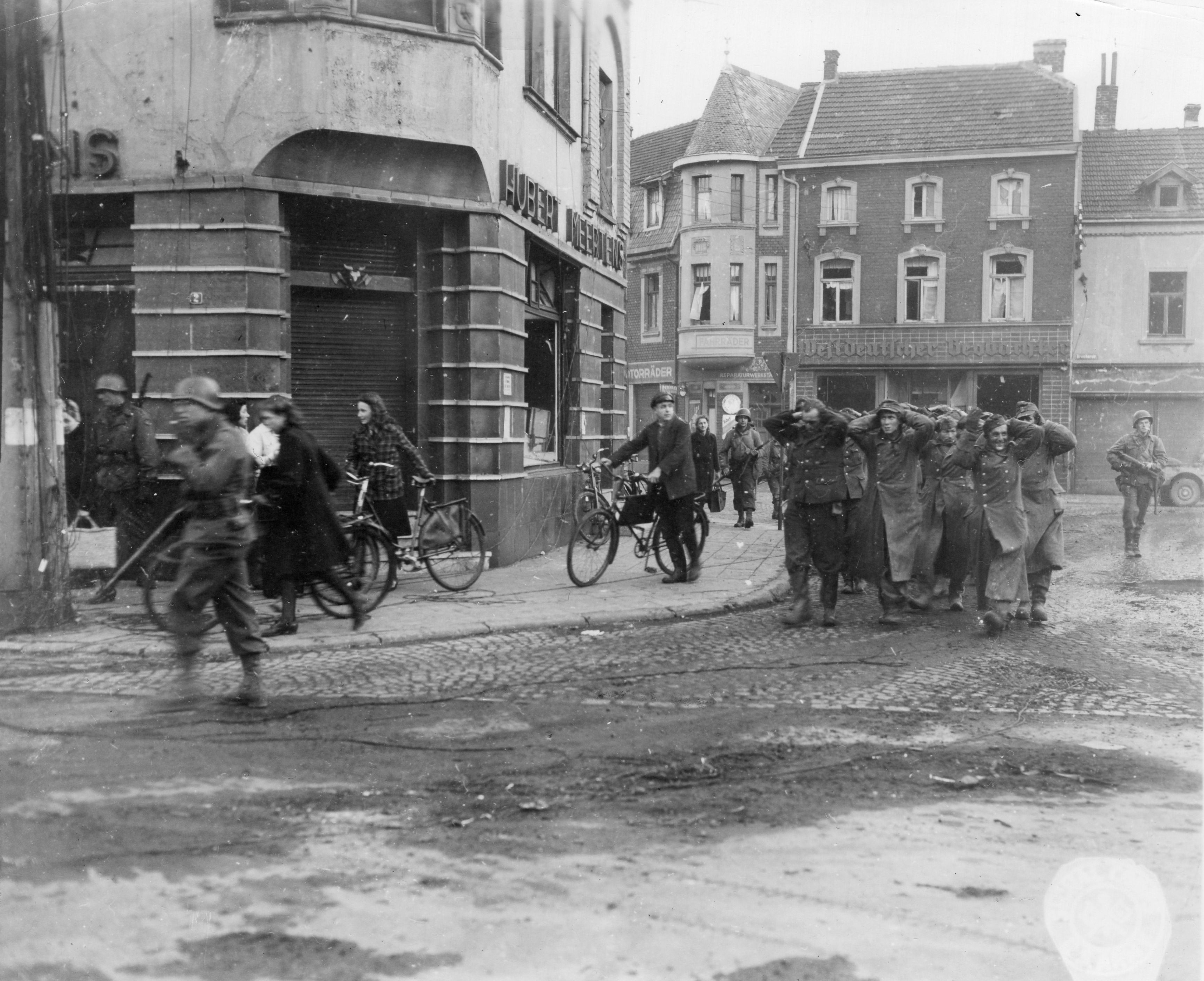 German prisoners captured in the new drive between Alsdorf and Mariadorf, Germany, march under guard in German street. 16 November, 1944.