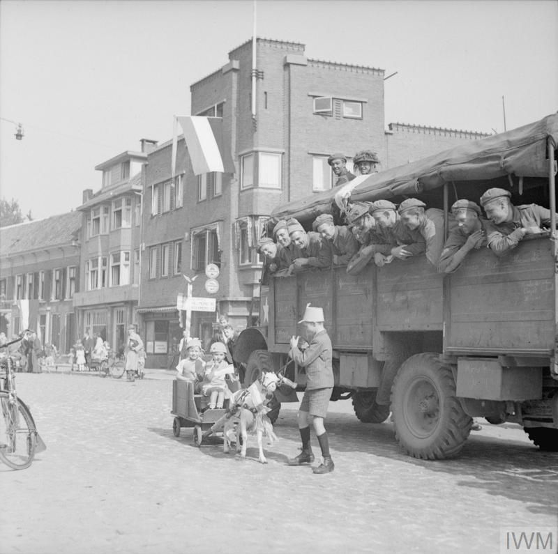 A little Dutch boy leading a goat-drawn cart, probably with his siblings seated in it, in the streets of liberated Eindhoven, 19 September 1944. British troops in a truck are observing the scene with amusement.