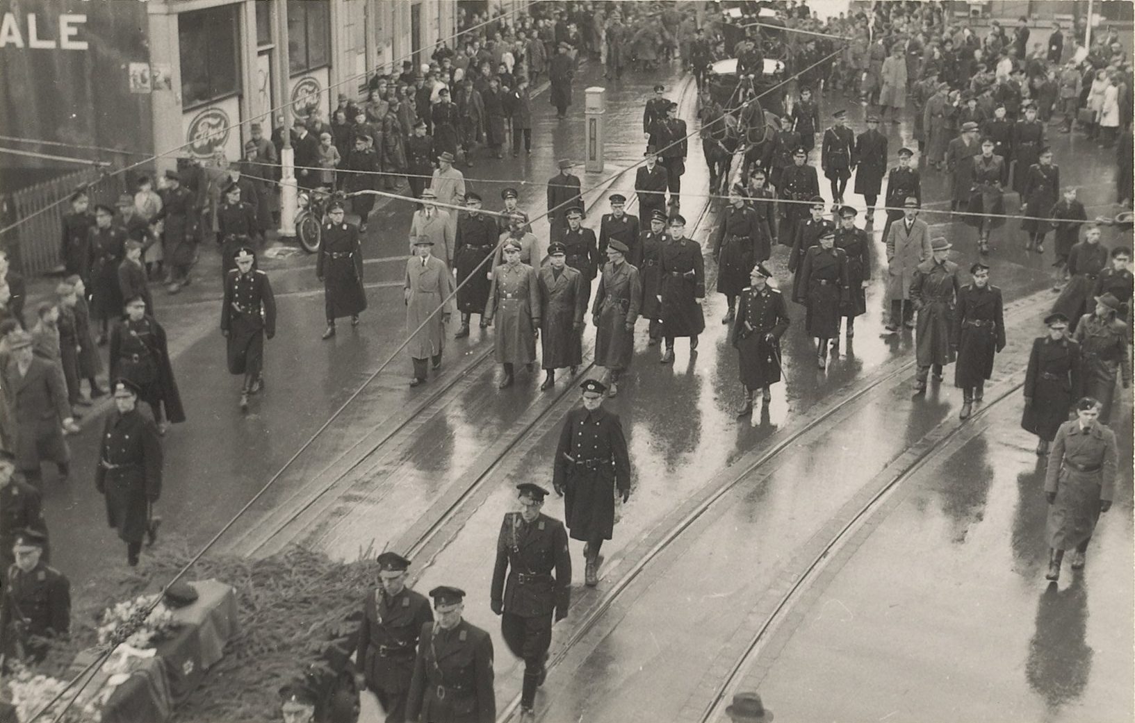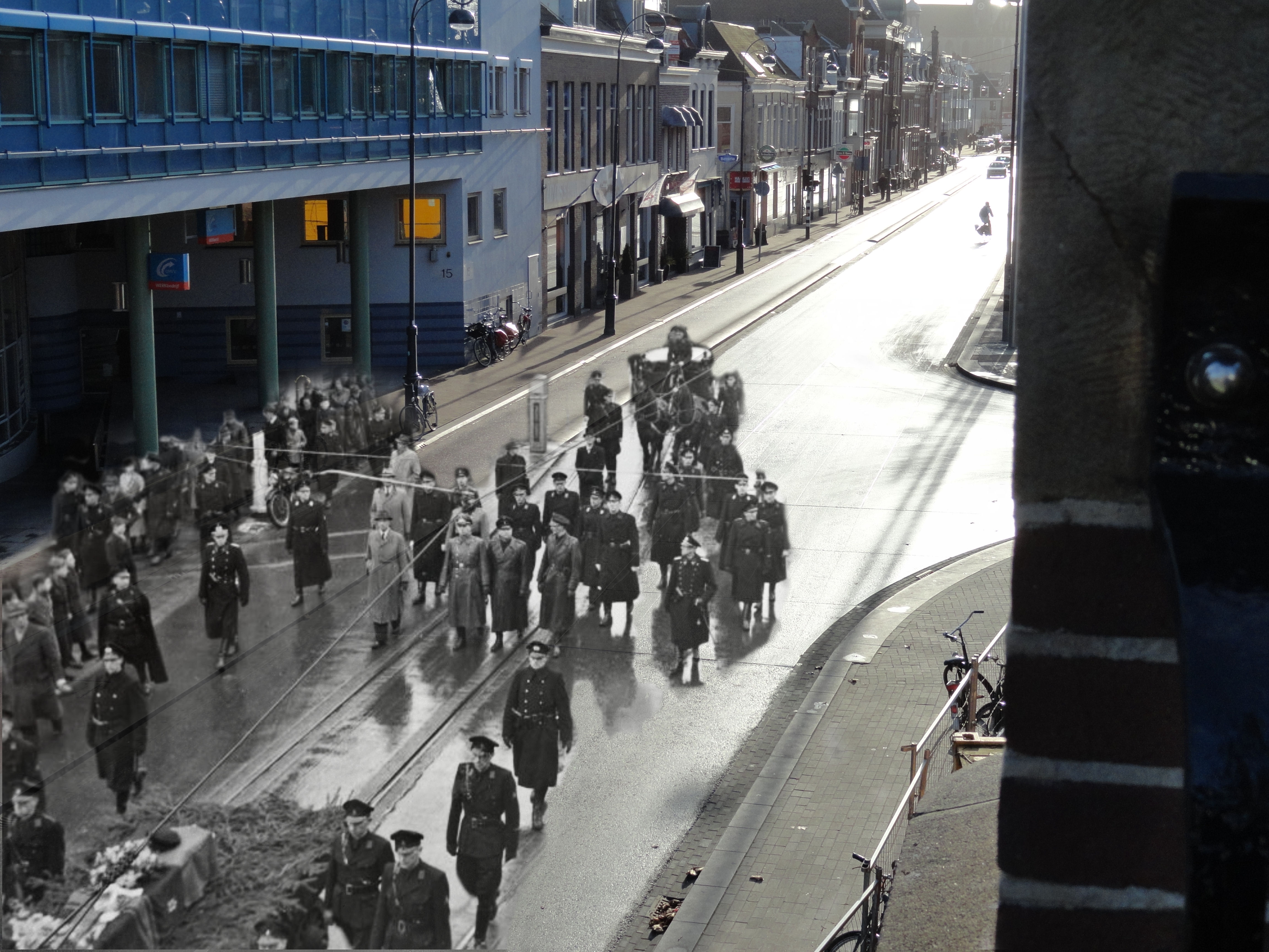 Funeral march for the murdered W.A.man H.Bannink in February 1943 at the Jansweg in Haarlem. In the middle of the picture Mussert. The leader of the NSB (National Social Movement)