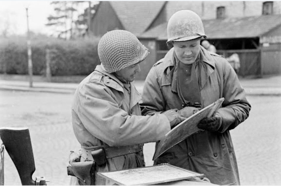 Same soldiers as before but from a different angle checking a map of the city of Lippstadt after captering the city in april 1945.