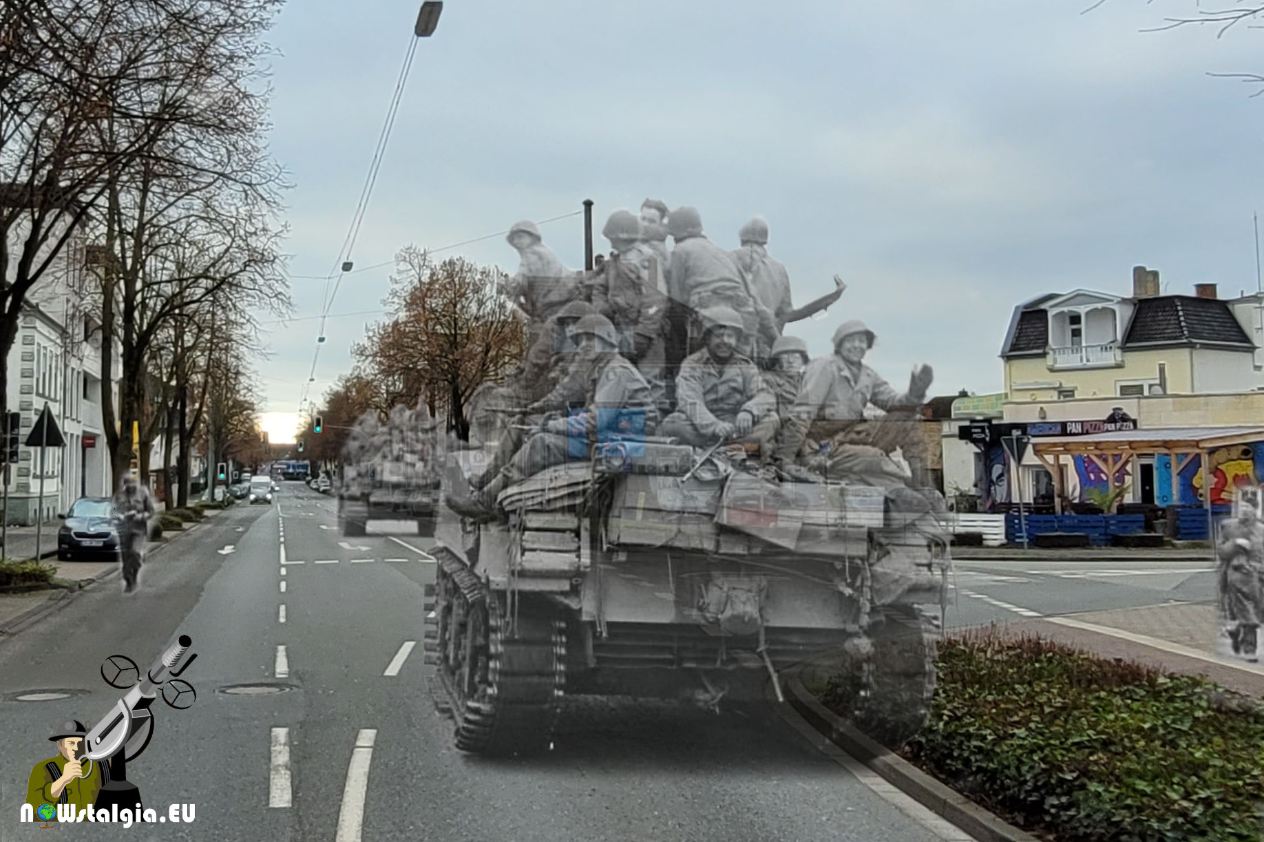 From another angle the lead elements of an Allied Army Group at Lippstadt on 1 April 1945 after the encirclement of Germany’s Army Group B on the western front.