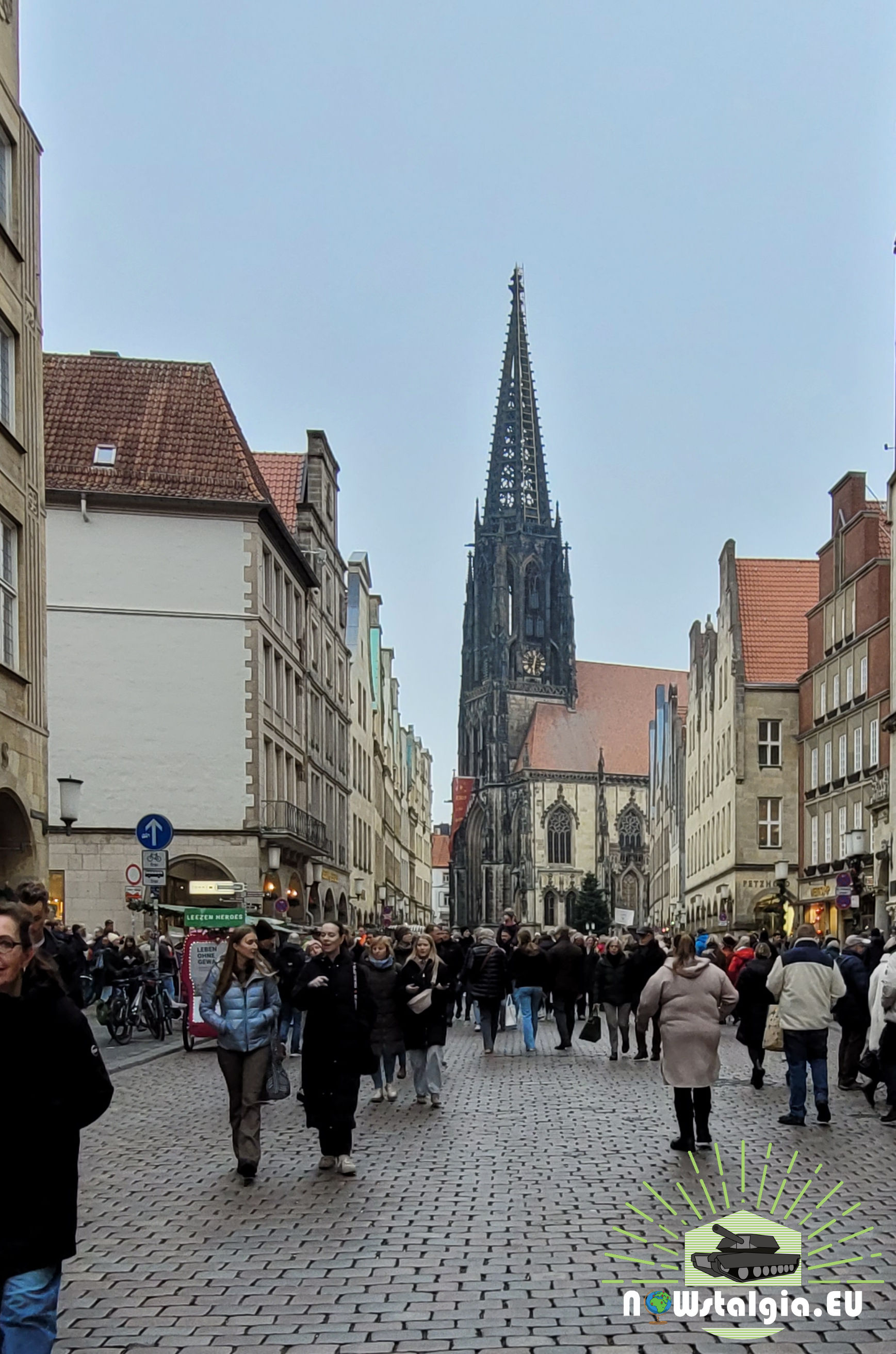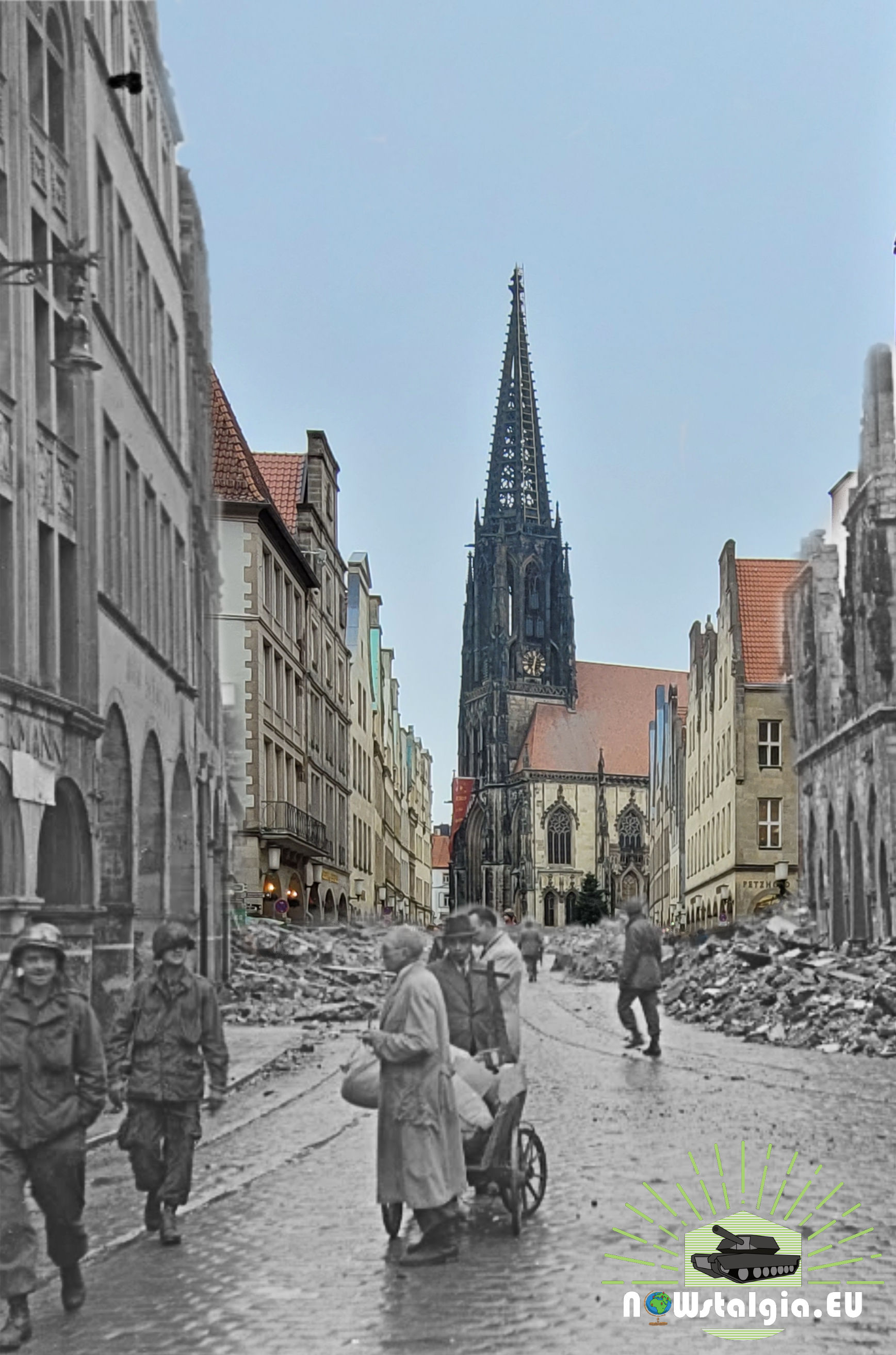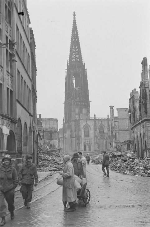 Allied soldiers in the war damaged city of Münster around april 1945 with in the background the St.Lamberti church.