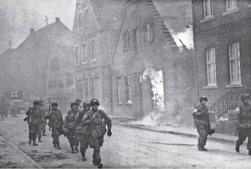 Paratroopers of the 17th US Airborne Division march in a line of riflemen over the B 51 in Appelhülsen, which is covered in smoke from burning houses.