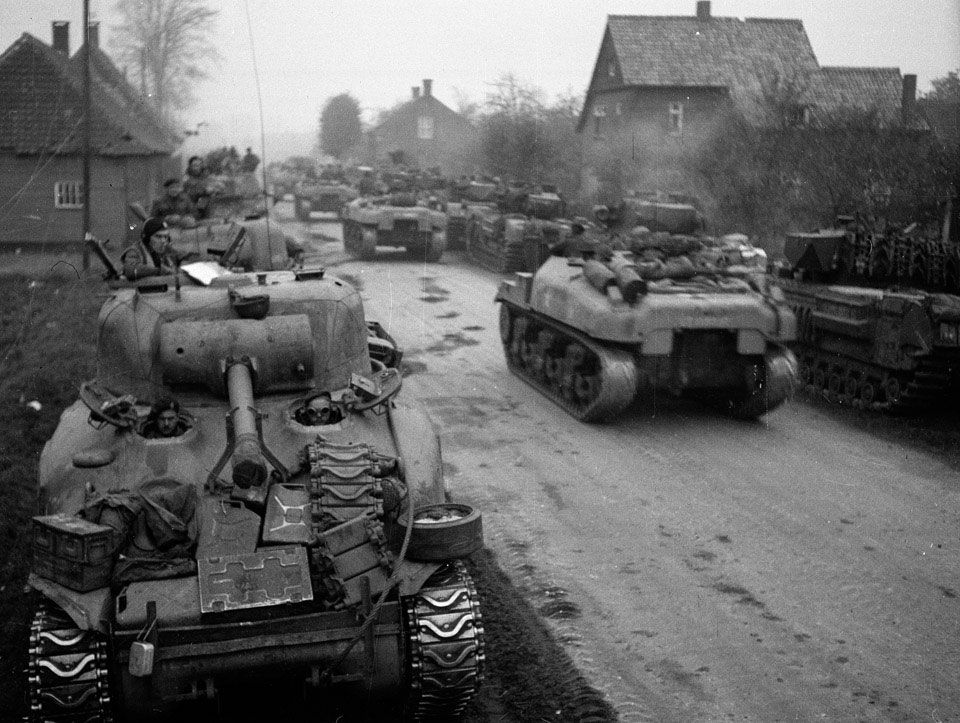 The Sherman, from 3rd/4th County of London Yeomanry, is being passed by troop-carrying Kangaroos from 15th Scottish Division, 15 October 1944.