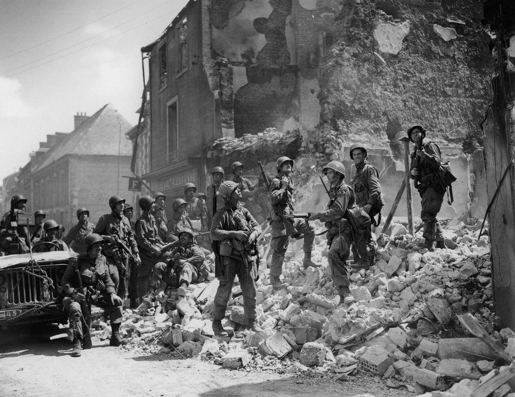 Paratroopers of the 101st Airborne standing on the ruins of a house after the Battle of Carentan 15 June 1944.
