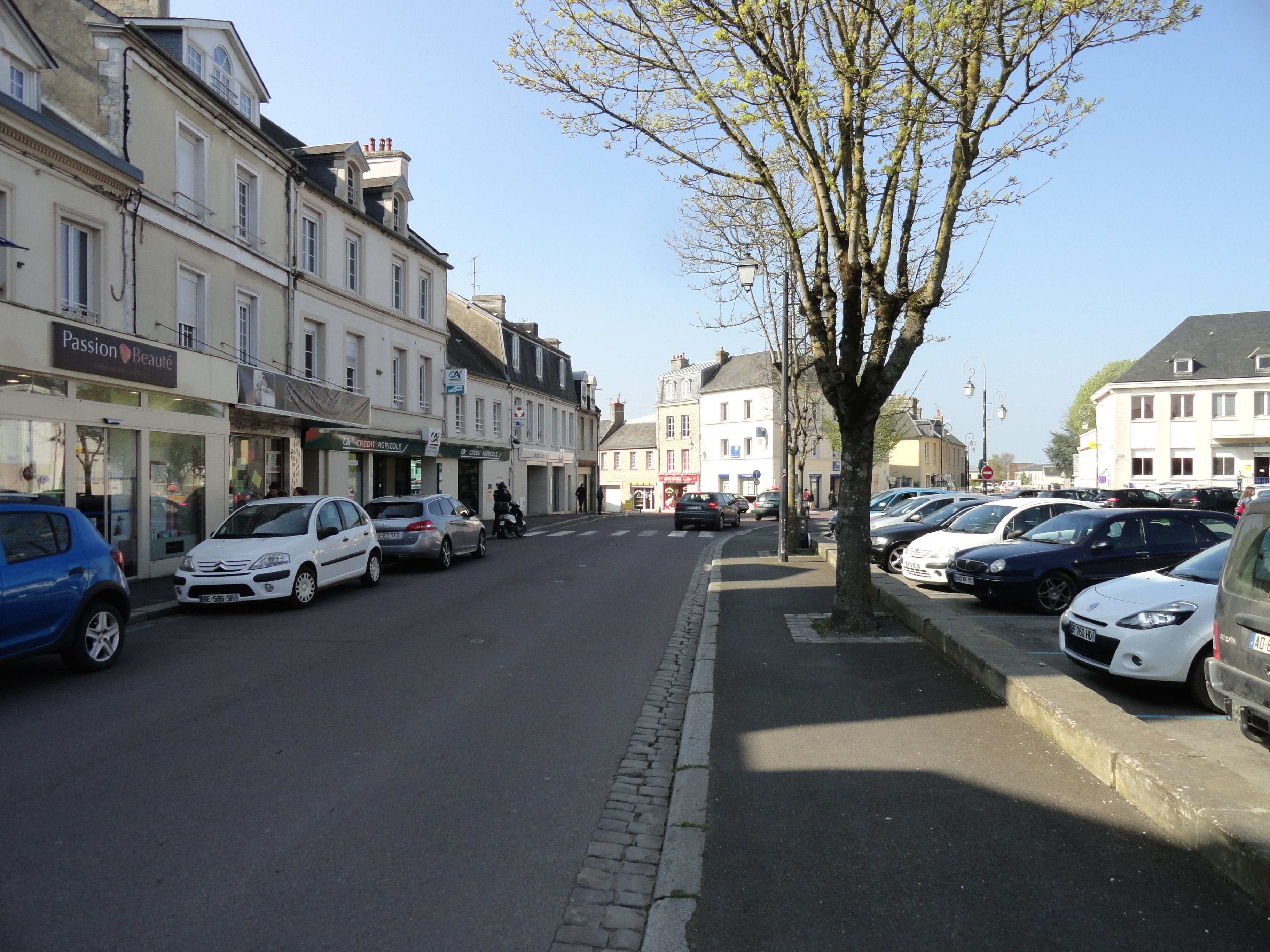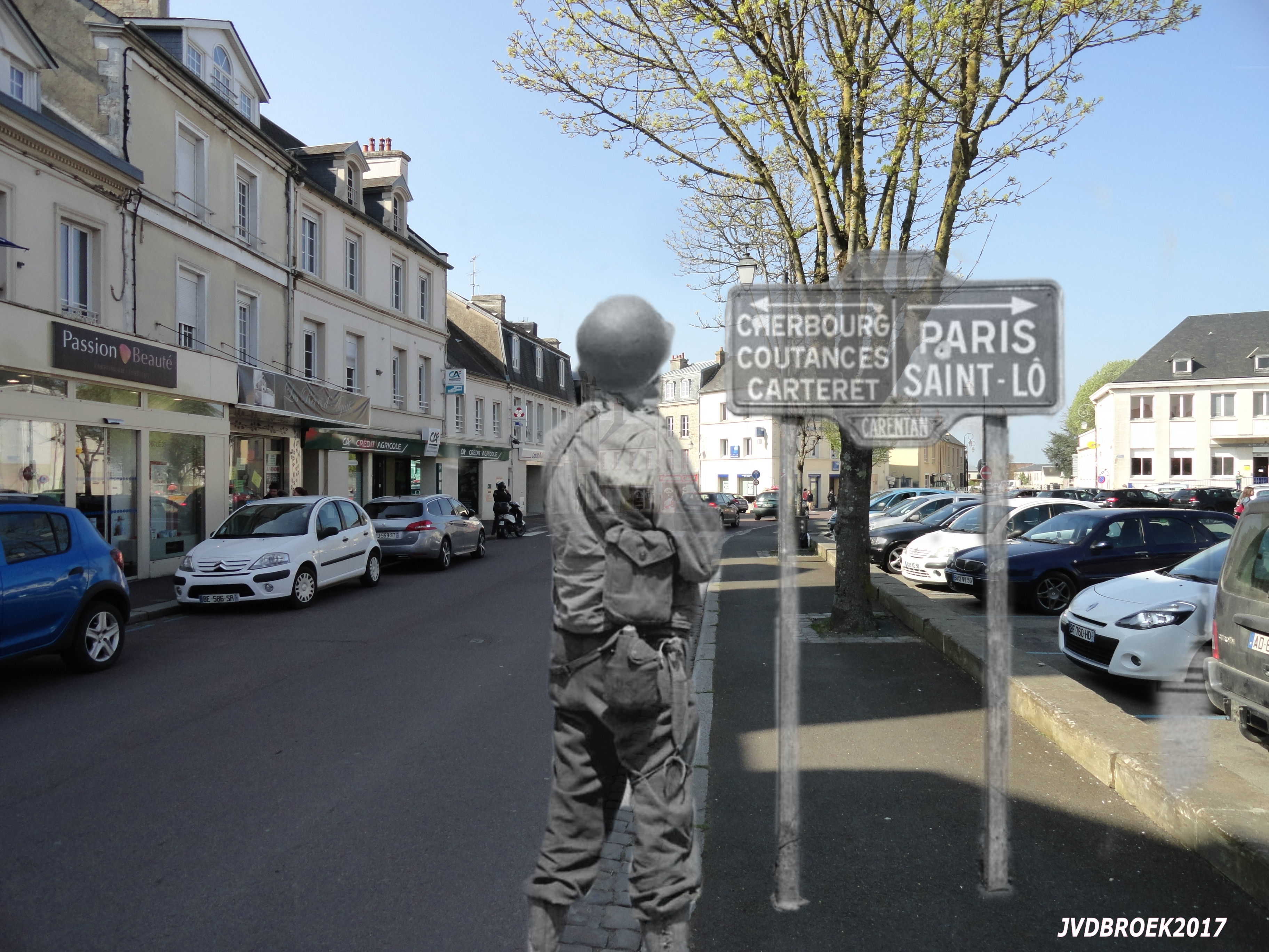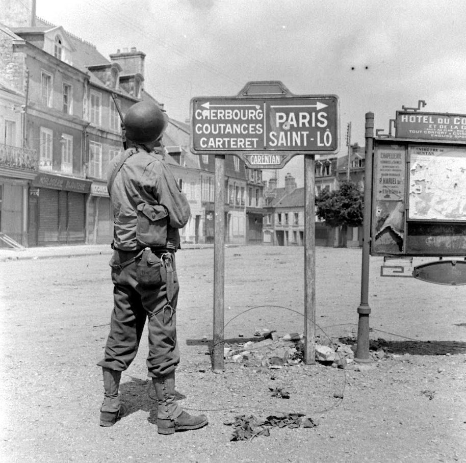 GI from the paratroopers of the 327th Glider Infantry Regiment, 101st US in front of a road sign at the Rue Sebline in Carentan.