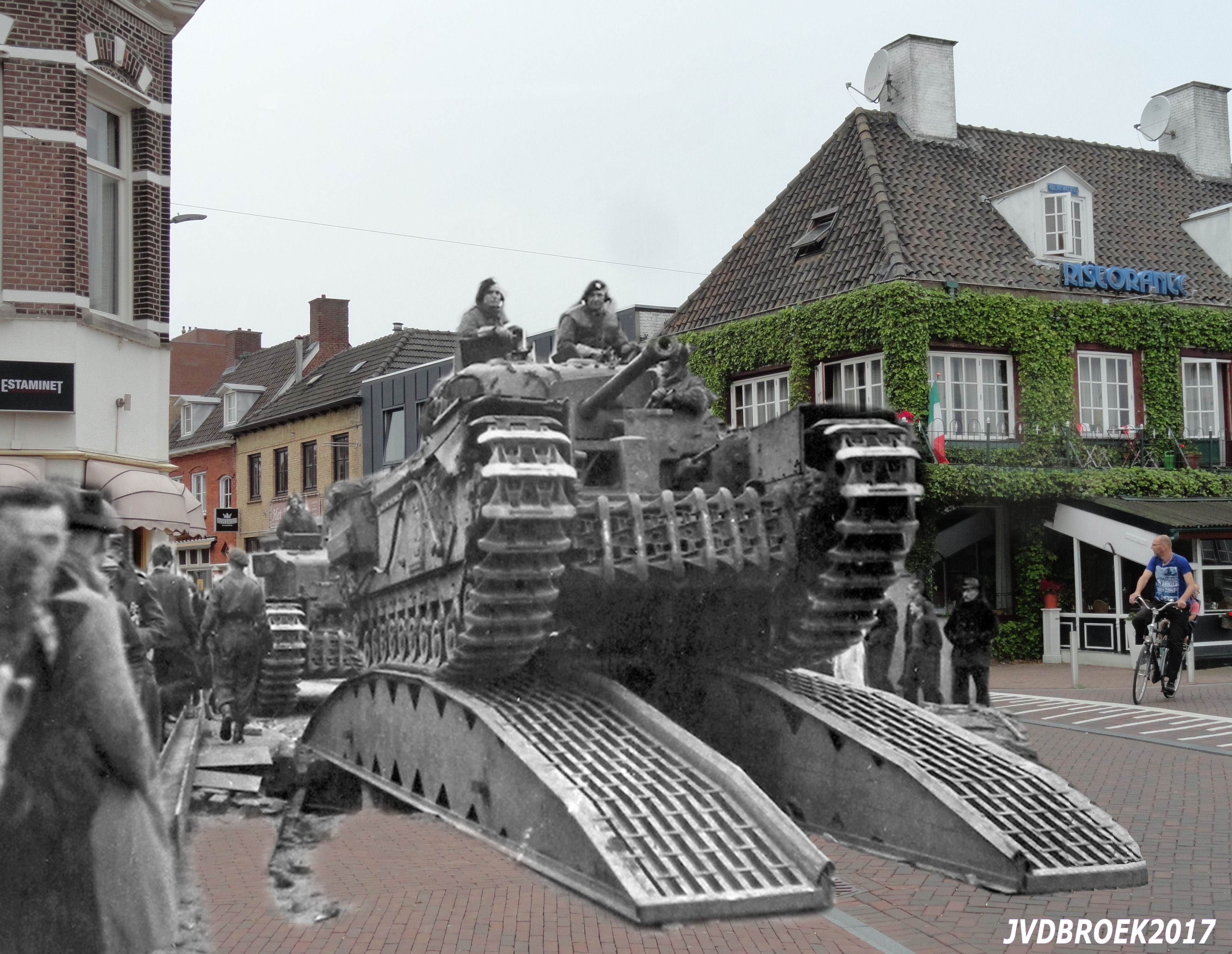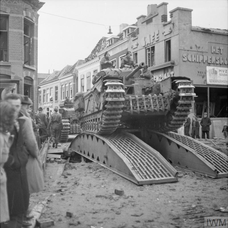 Churchill tanks of 34th Tank Brigade cross a temporary bridge in Roosendaal, The Netherlands, 30 October 1944.