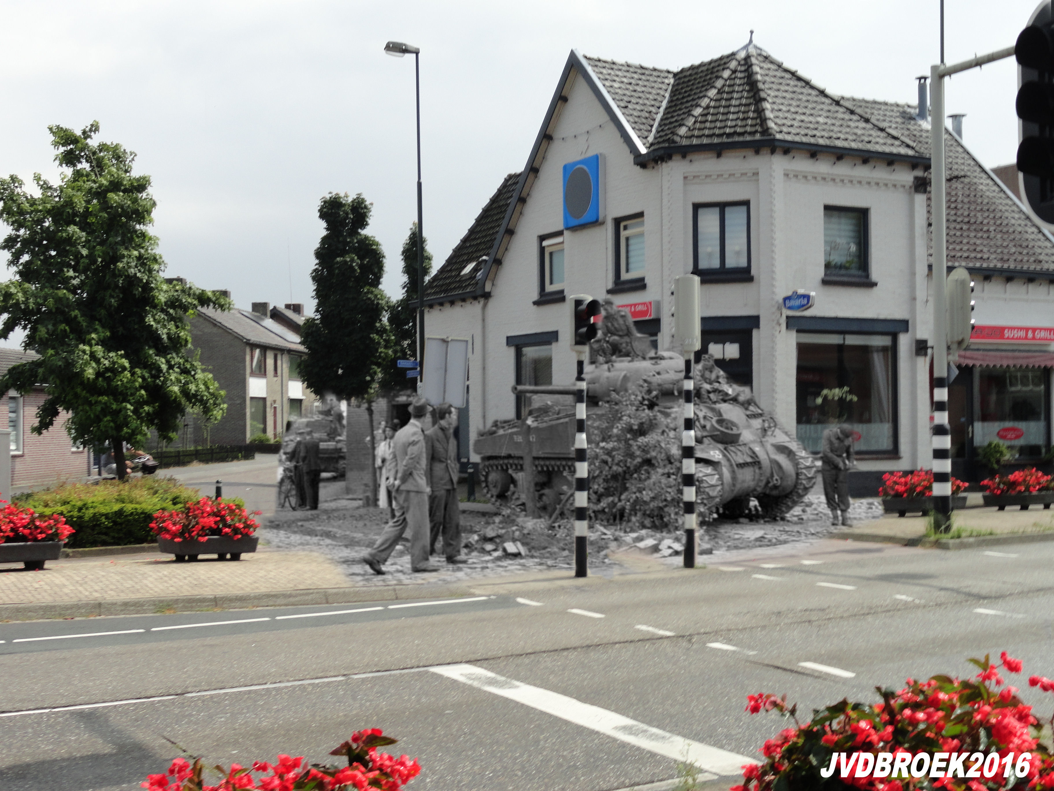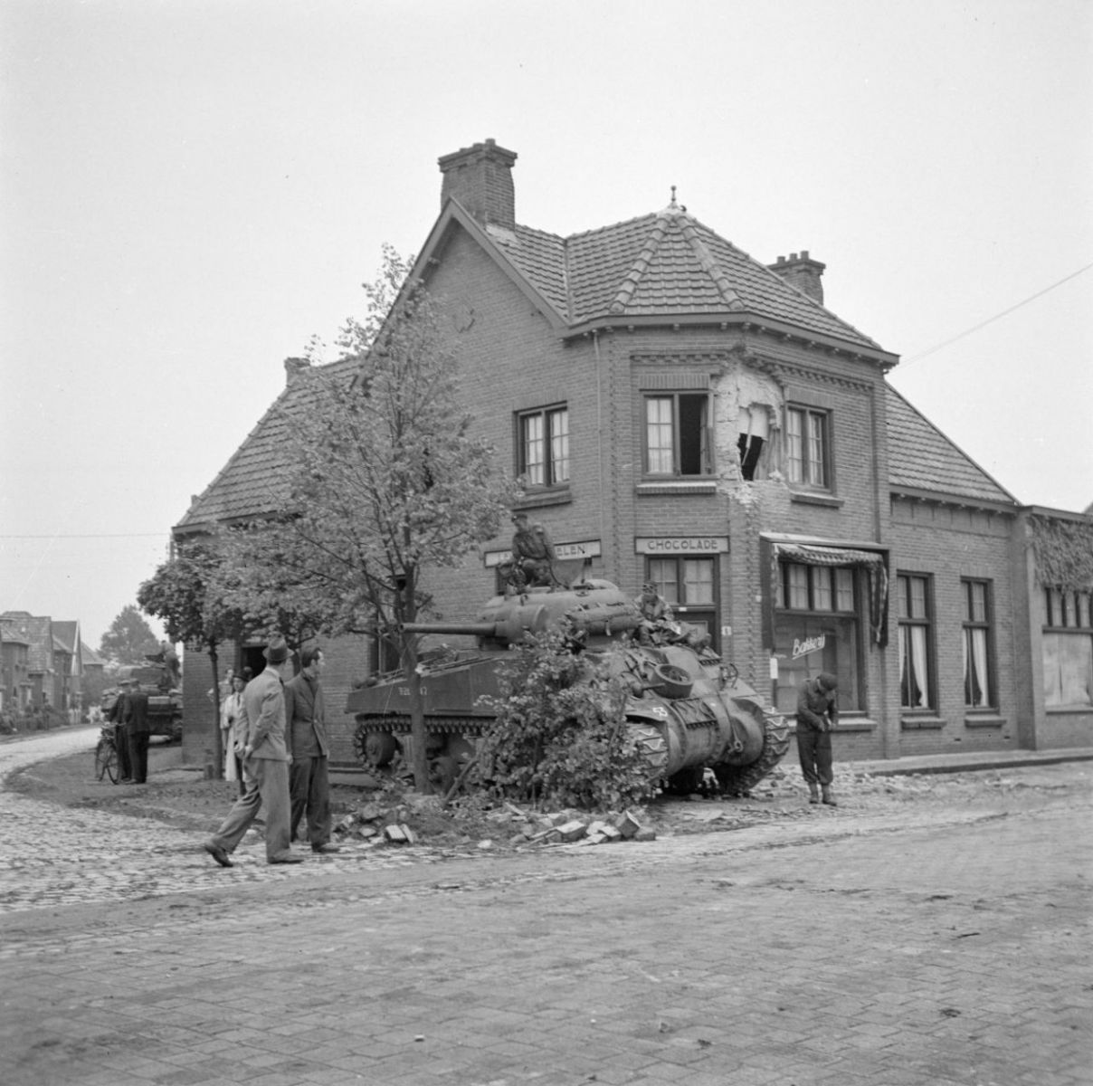 Tankunits from the Irish guards before a heavily damaged bakery in Aalst, 18 september 1944.